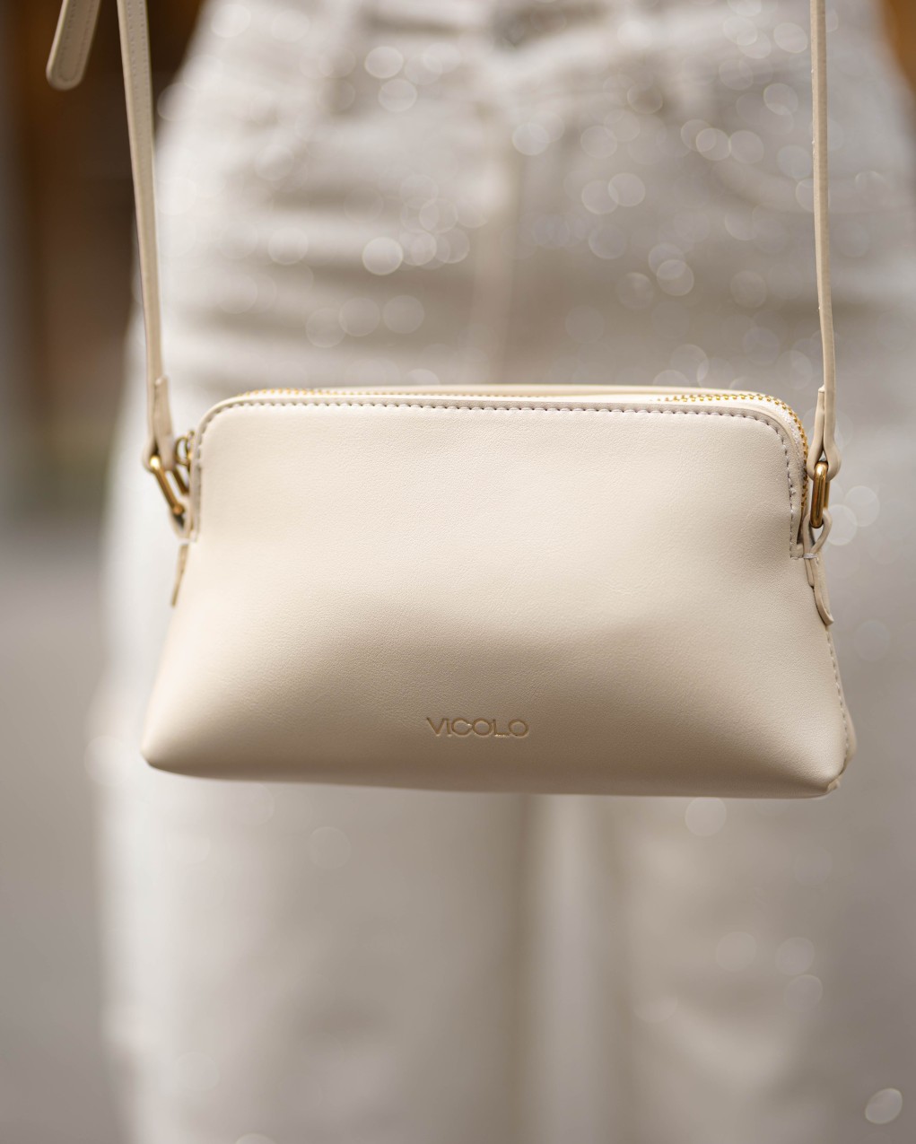 Borsa a tracolla compatta Vicolo dallo stile minimalista e contemporaneo. Realizzata in ecopelle di alta qualità con finitura liscia, presenta una chiusura con zip superiore e tracolla regolabile con dettagli in metallo dorato. Il design essenziale e la dimensione pratica la rendono perfetta per l'uso quotidiano, offrendo spazio sufficiente per gli oggetti essenziali. Modello versatile che si adatta a outfit casual ed eleganti.
