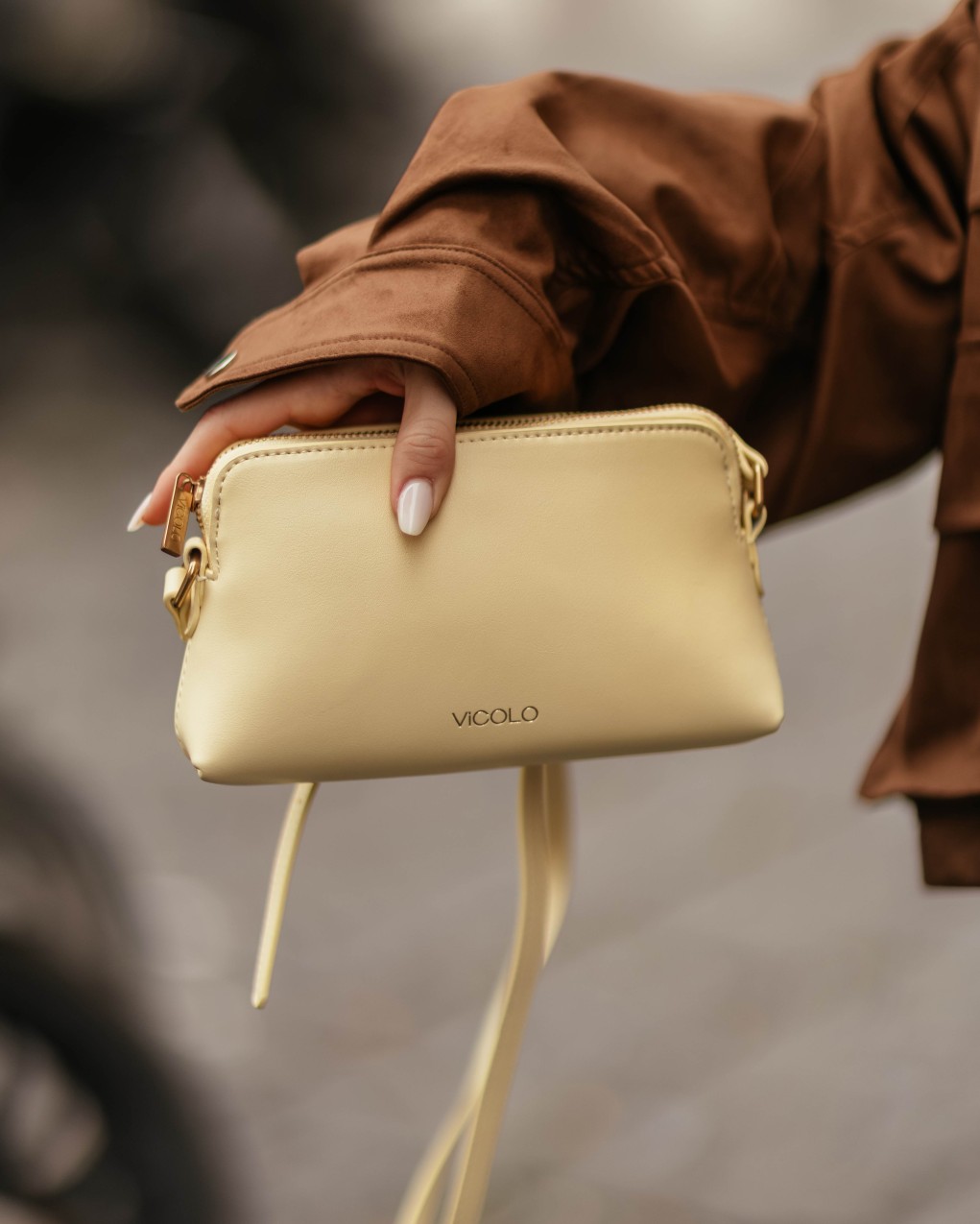 Borsa a tracolla compatta Vicolo dallo stile minimalista e contemporaneo. Realizzata in ecopelle di alta qualità con finitura liscia, presenta una chiusura con zip superiore e tracolla regolabile con dettagli in metallo dorato. Il design essenziale e la dimensione pratica la rendono perfetta per l'uso quotidiano, offrendo spazio sufficiente per gli oggetti essenziali. Modello versatile che si adatta a outfit casual ed eleganti.