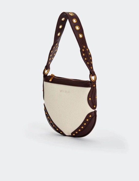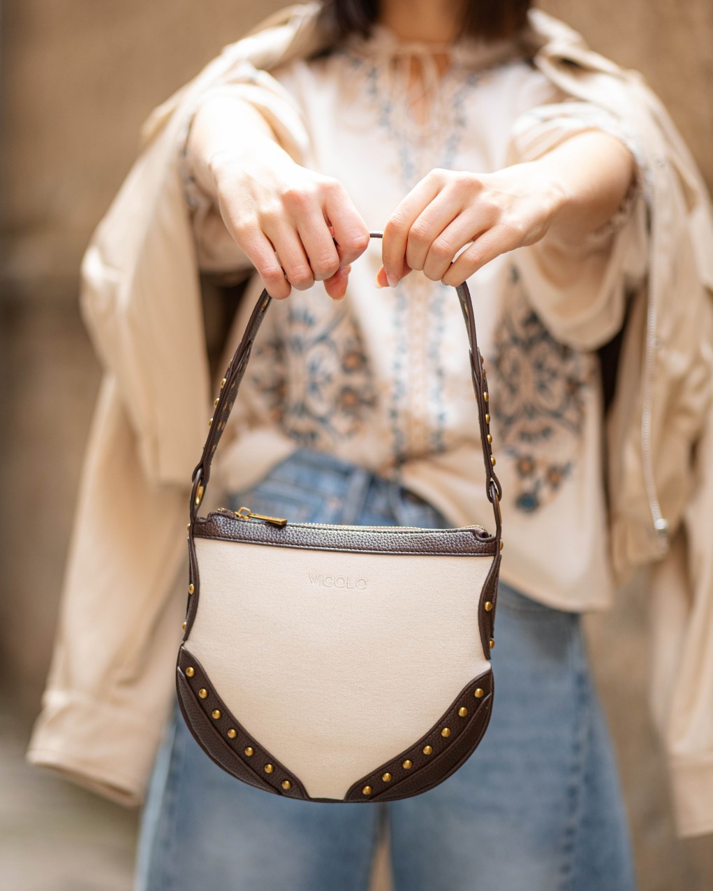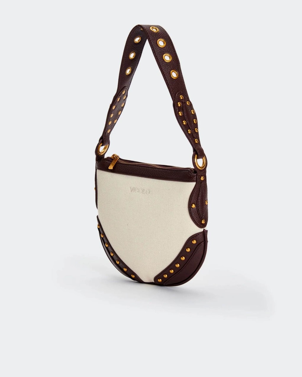 Borsa Canter a spalla in canvas e ecopelle martellata con borchie. Chiusura con cerniera. Dettaglio logo Vicolo ricamato. Dettaglio finiture in metallo color oro. Tasca interna con cerniera e taschina piatta.