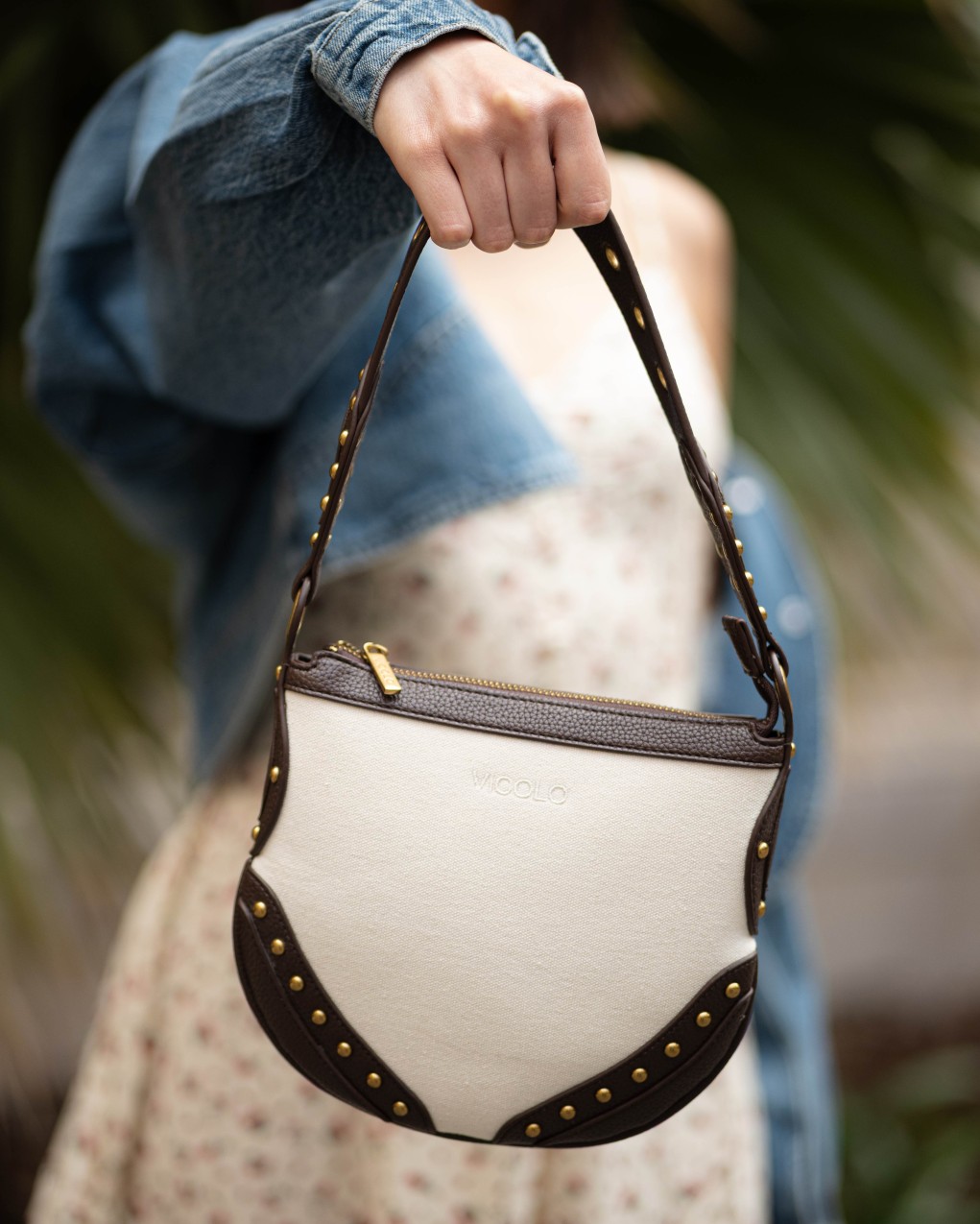 Borsa Canter a spalla in canvas e ecopelle martellata con borchie. Chiusura con cerniera. Dettaglio logo Vicolo ricamato. Dettaglio finiture in metallo color oro. Tasca interna con cerniera e taschina piatta.