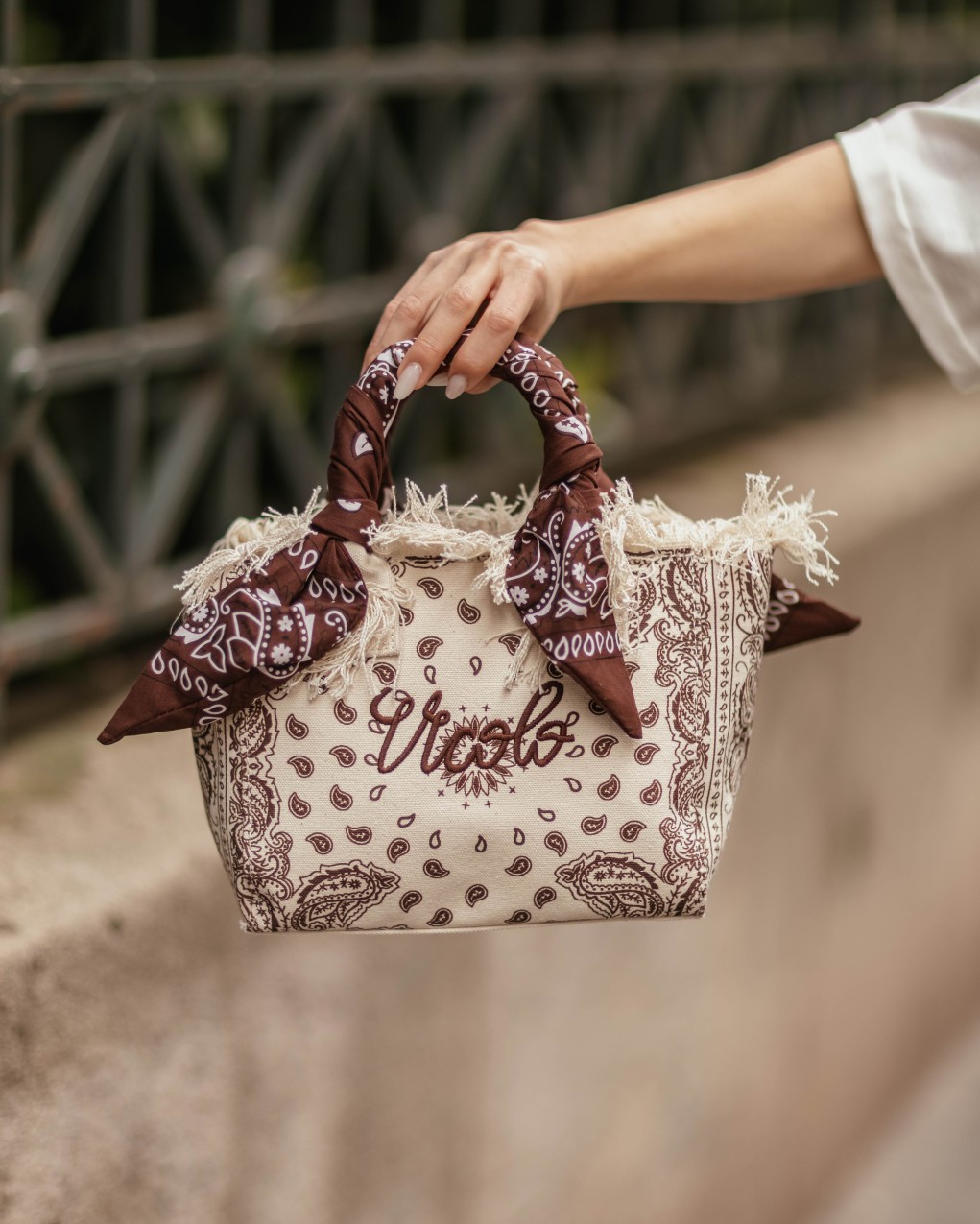 Borsa tote in tessuto con stampa paisley dallo stile bohémien contemporaneo. Caratterizzata da dettagli in rafia sfrangiata lungo i bordi e manici decorati con foulard annodati per un tocco distintivo. Realizzata in materiale canvas resistente, ideale per un uso quotidiano casual. La vestibilità è comoda con capienza media, perfetta per essere portata a mano o al braccio.