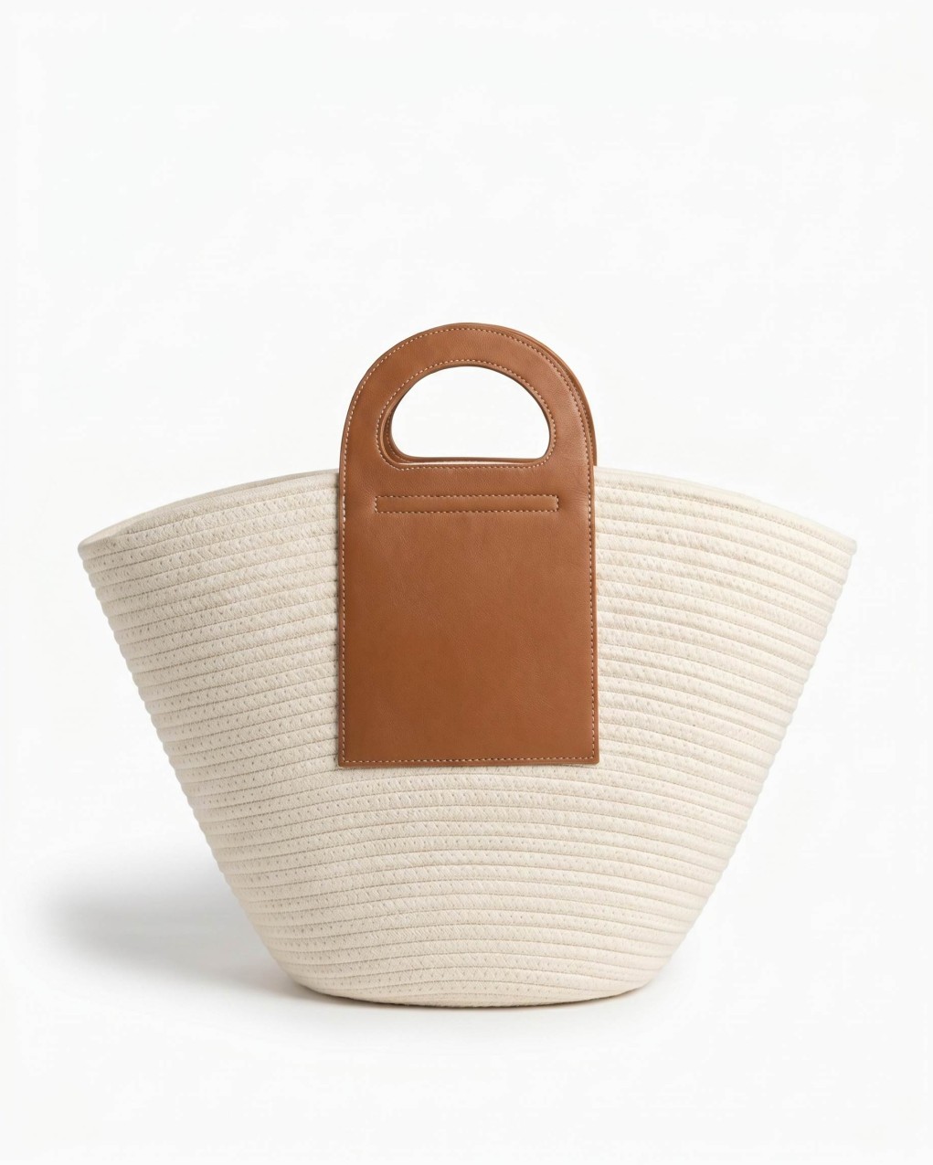 Elegante borsa shopper dal design contemporaneo, perfetta per il tempo libero e le giornate estive. Realizzata in cotone intrecciato con texture a coste, presenta un pratico manico in pelle con impunture a contrasto che garantisce comfort e resistenza. La capiente struttura arrotondata offre ampio spazio interno, mentre i dettagli in pelle conciata aggiungono un tocco di raffinatezza artigianale. Design versatile e resistente, ideale per shopping, mare o uso quotidiano.