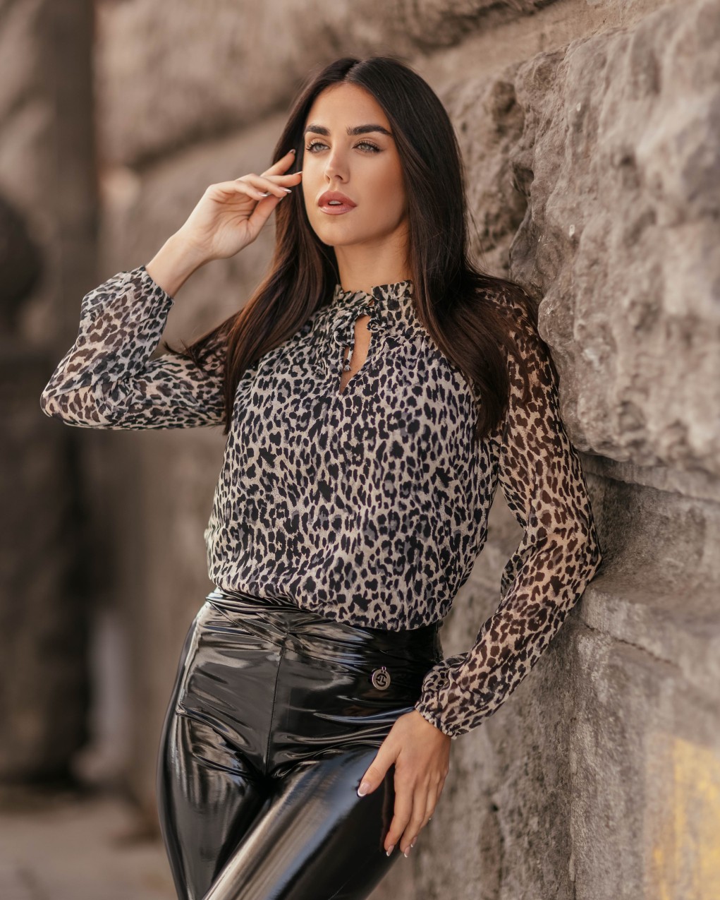 Elegante blusa in tessuto leggero con raffinato motivo animalier, caratterizzata da un delicato collo a gorgiera e maniche lunghe con polsini elasticizzati. Il design presenta una linea morbida con arricciatura sotto il seno che crea un effetto leggermente drappeggiato. Realizzata in morbido chiffon, questa blusa versatile offre una vestibilità comoda e femminile, perfetta per outfit sia casual che più formali.