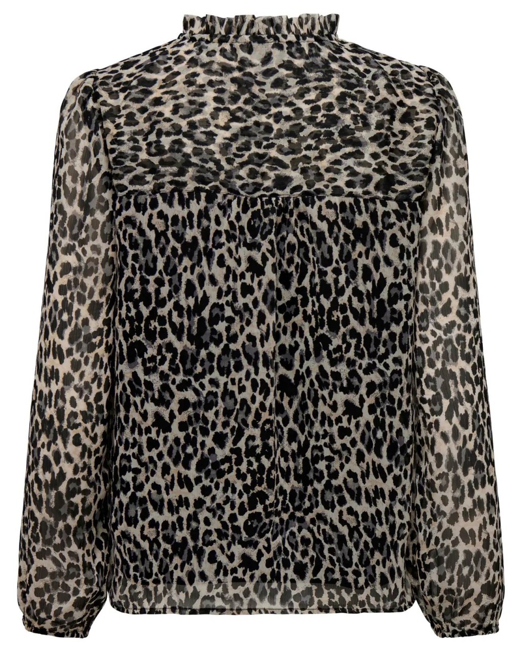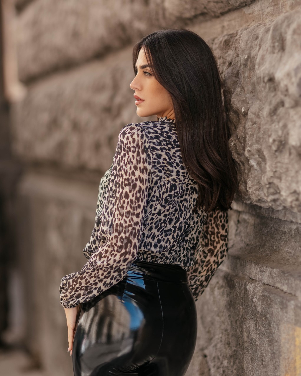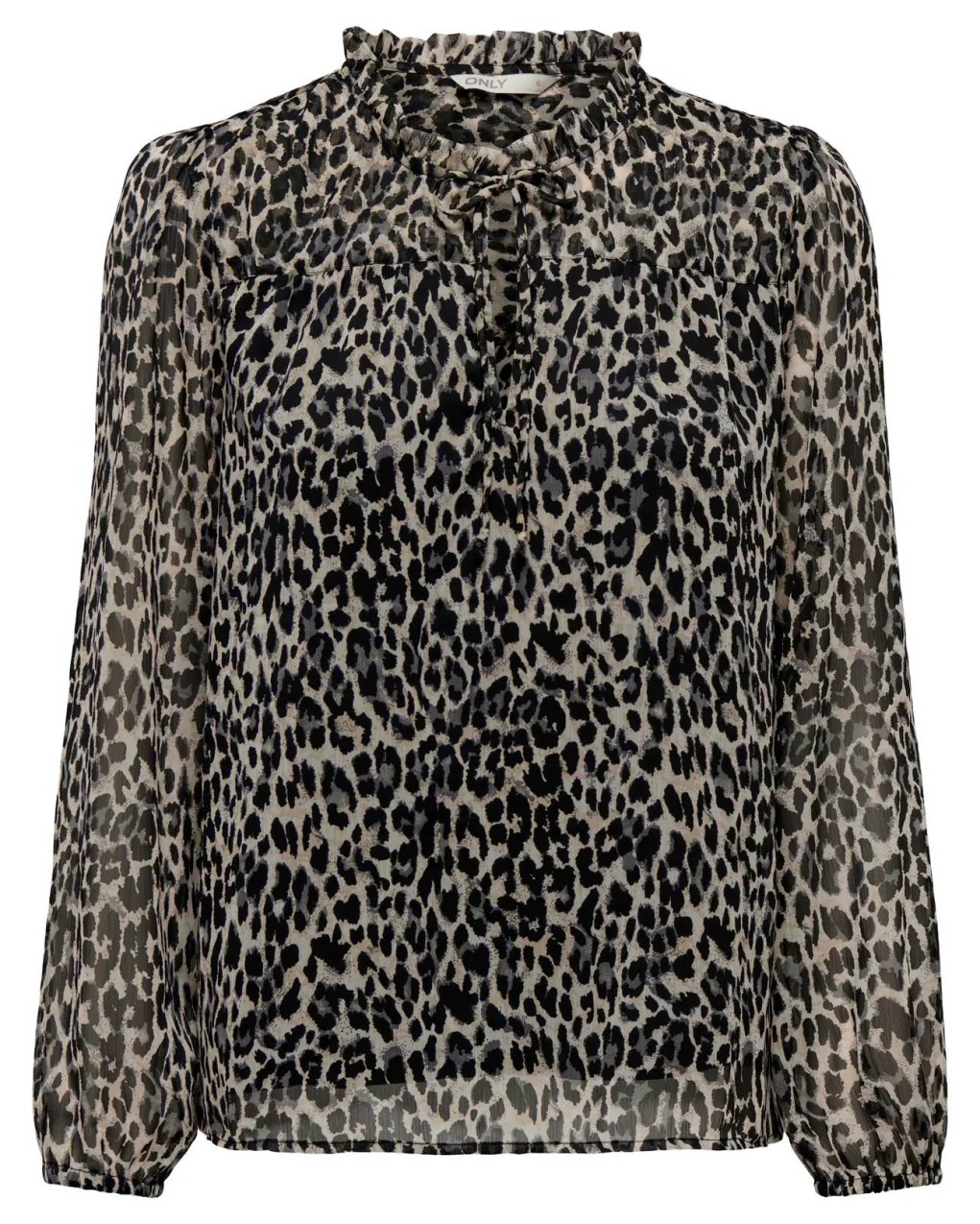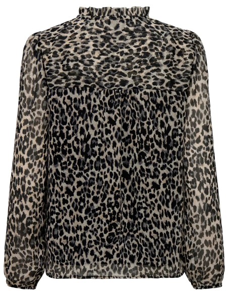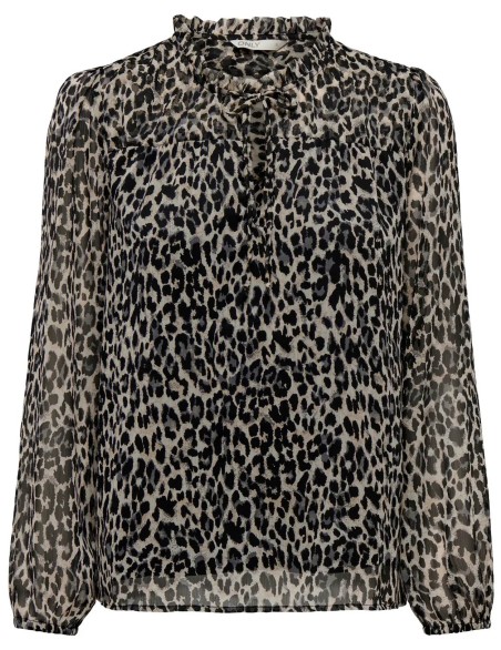 Elegante blusa in tessuto leggero con raffinato motivo animalier, caratterizzata da un delicato collo a gorgiera e maniche lunghe con polsini elasticizzati. Il design presenta una linea morbida con arricciatura sotto il seno che crea un effetto leggermente drappeggiato. Realizzata in morbido chiffon, questa blusa versatile offre una vestibilità comoda e femminile, perfetta per outfit sia casual che più formali.