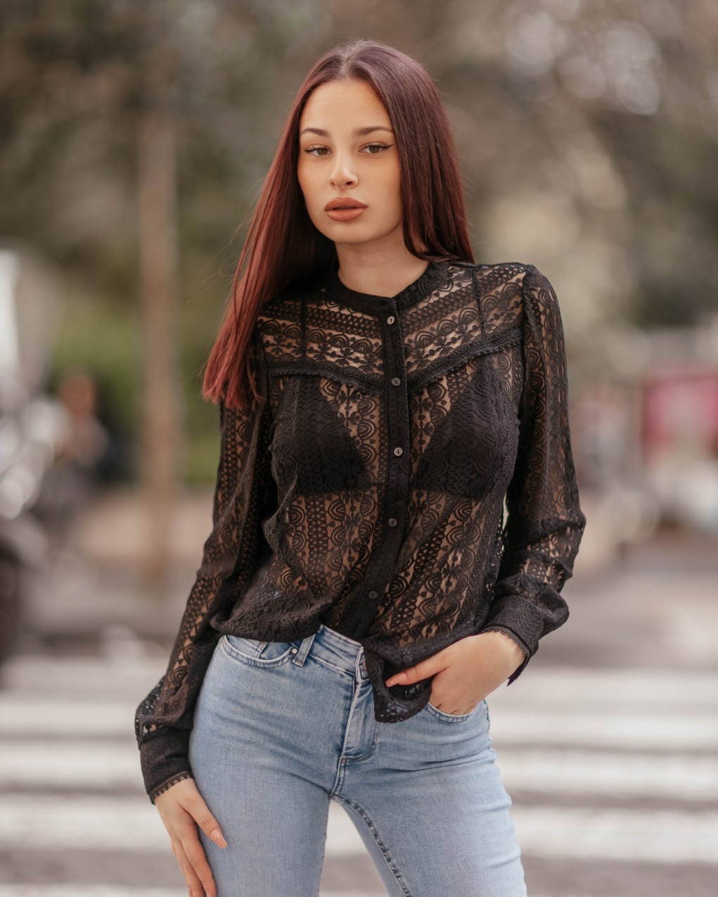 ●Elegante e sensuale, questa camicia in pizzo nero presenta una lavorazione trasparente con dettagli raffinati.