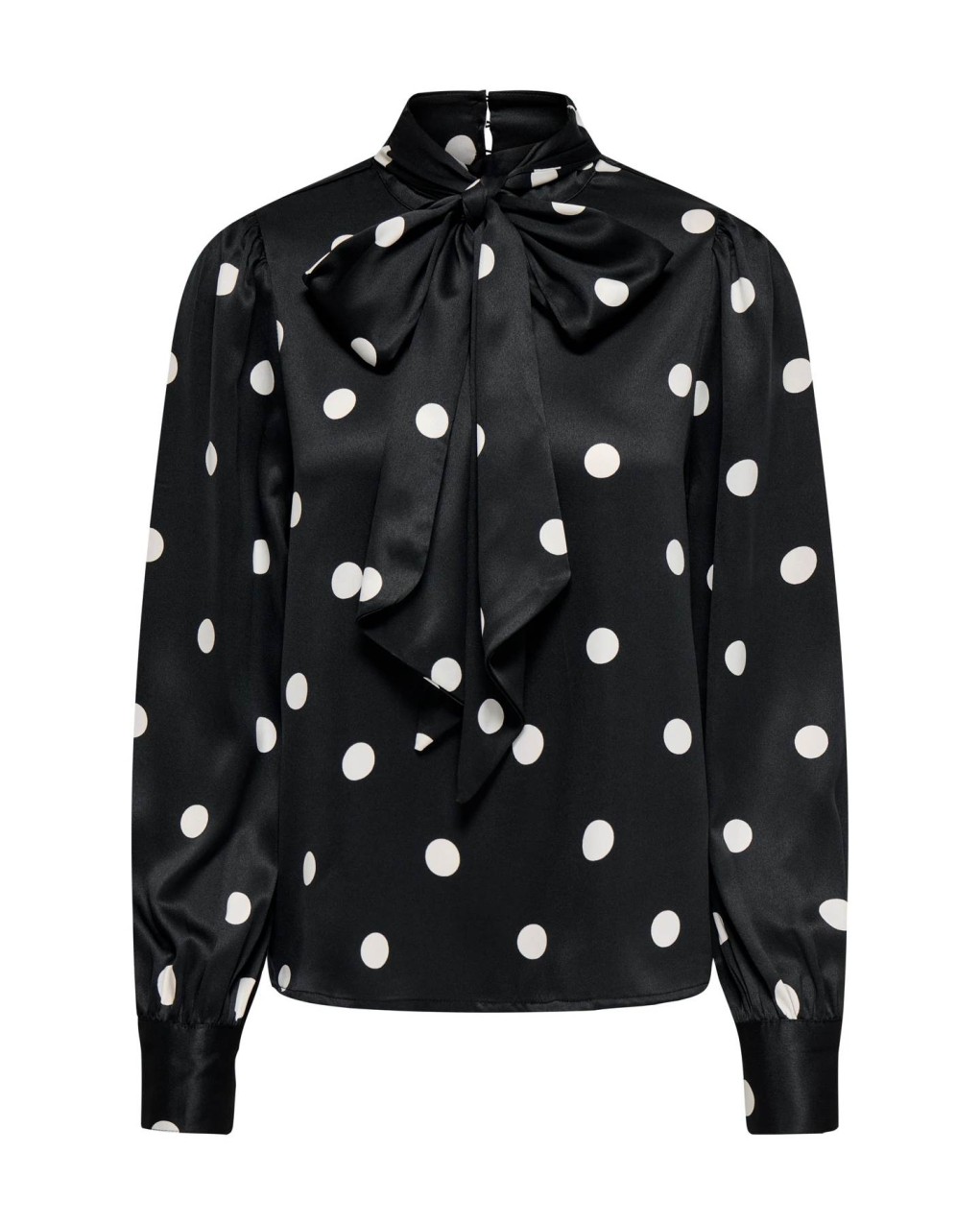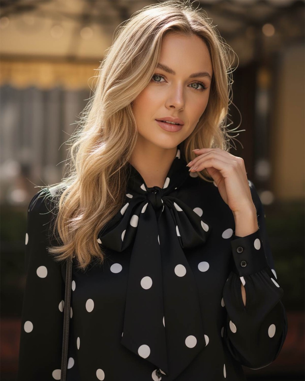 ●Elegante blusa a pois con collo alto e raffinati bottoni decorativi. Realizzata in morbido tessuto satinato, presenta maniche a palloncino con polsini abbottonati per un tocco vintage. Il taglio leggermente rilassato e la chiusura posteriore con bottoni la rendono perfetta per outfit sia formali che casual.