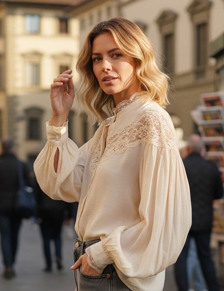Elegante blusa in stile vittoriano con preziosi inserti in pizzo al collo e ai polsini. Realizzata in morbido tessuto fluido, presenta maniche a palloncino ampie e romantiche con chiusura a bottone. Il taglio delicato e femminile si adatta perfettamente a ogni silhouette, ideale per outfit sofisticati da giorno e da sera.