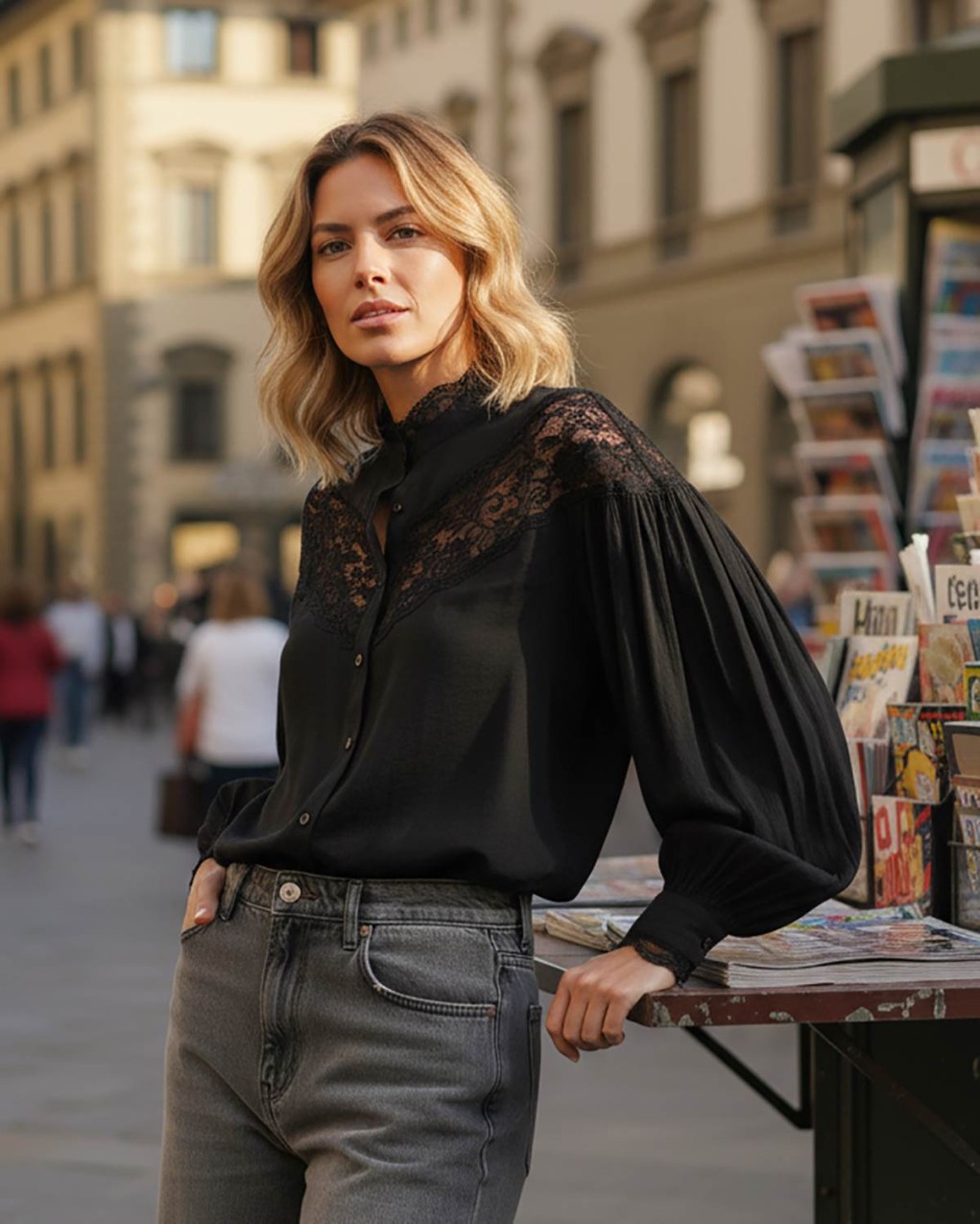Elegante blusa in stile vittoriano con preziosi inserti in pizzo al collo e ai polsini. Realizzata in morbido tessuto fluido, presenta maniche a palloncino ampie e romantiche con chiusura a bottone. Il taglio delicato e femminile si adatta perfettamente a ogni silhouette, ideale per outfit sofisticati da giorno e da sera.
