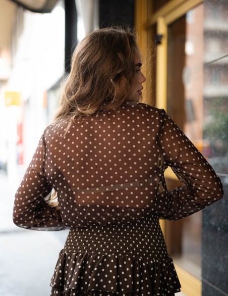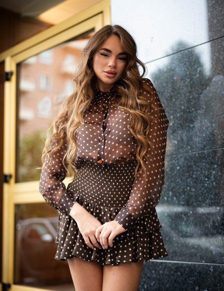 Elegante camicia a pois in morbido tessuto semitrasparente, perfetto per un look romantico e femminile. Il capo presenta maniche lunghe a sbuffo, colletto classico. La chiusura con bottoni sul davanti aggiunge un dettaglio raffinato.