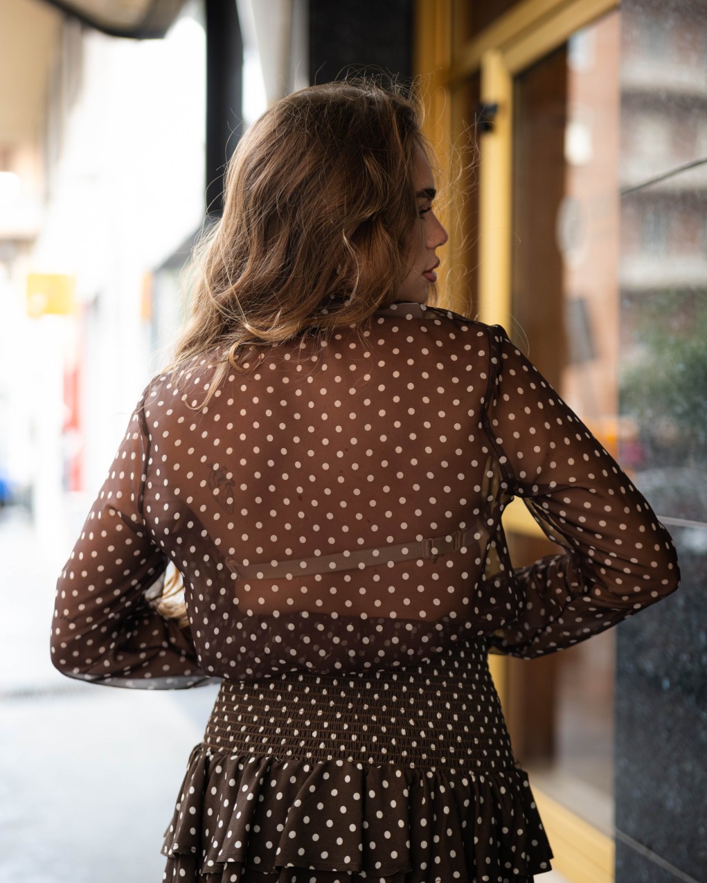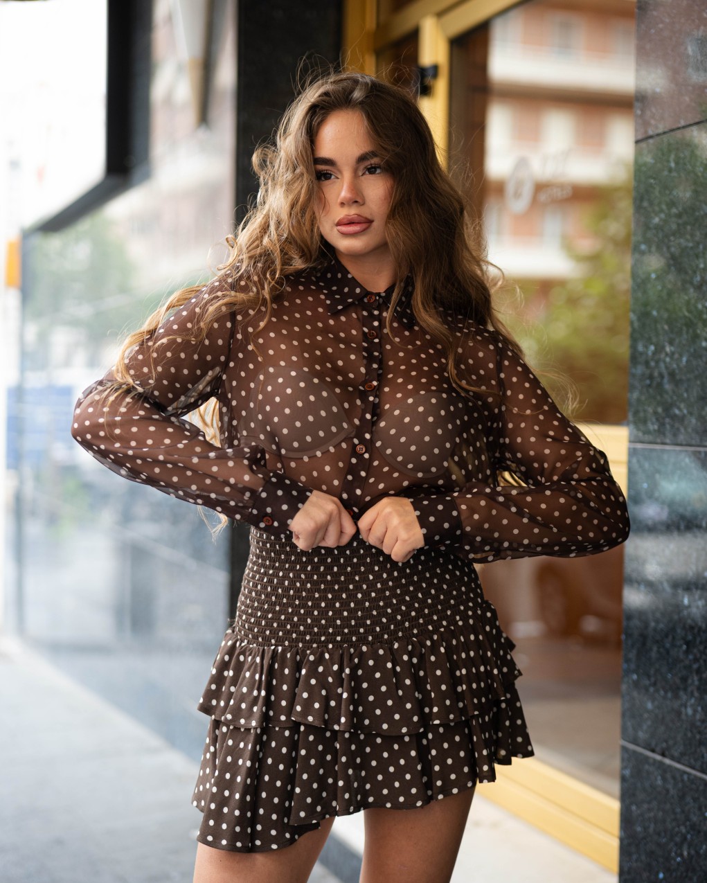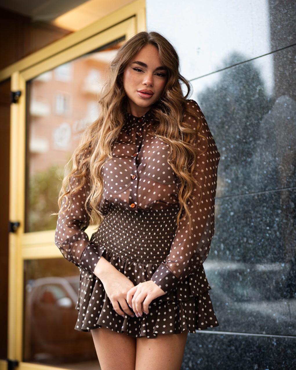 Elegante camicia a pois in morbido tessuto semitrasparente, perfetto per un look romantico e femminile. Il capo presenta maniche lunghe a sbuffo, colletto classico. La chiusura con bottoni sul davanti aggiunge un dettaglio raffinato.
