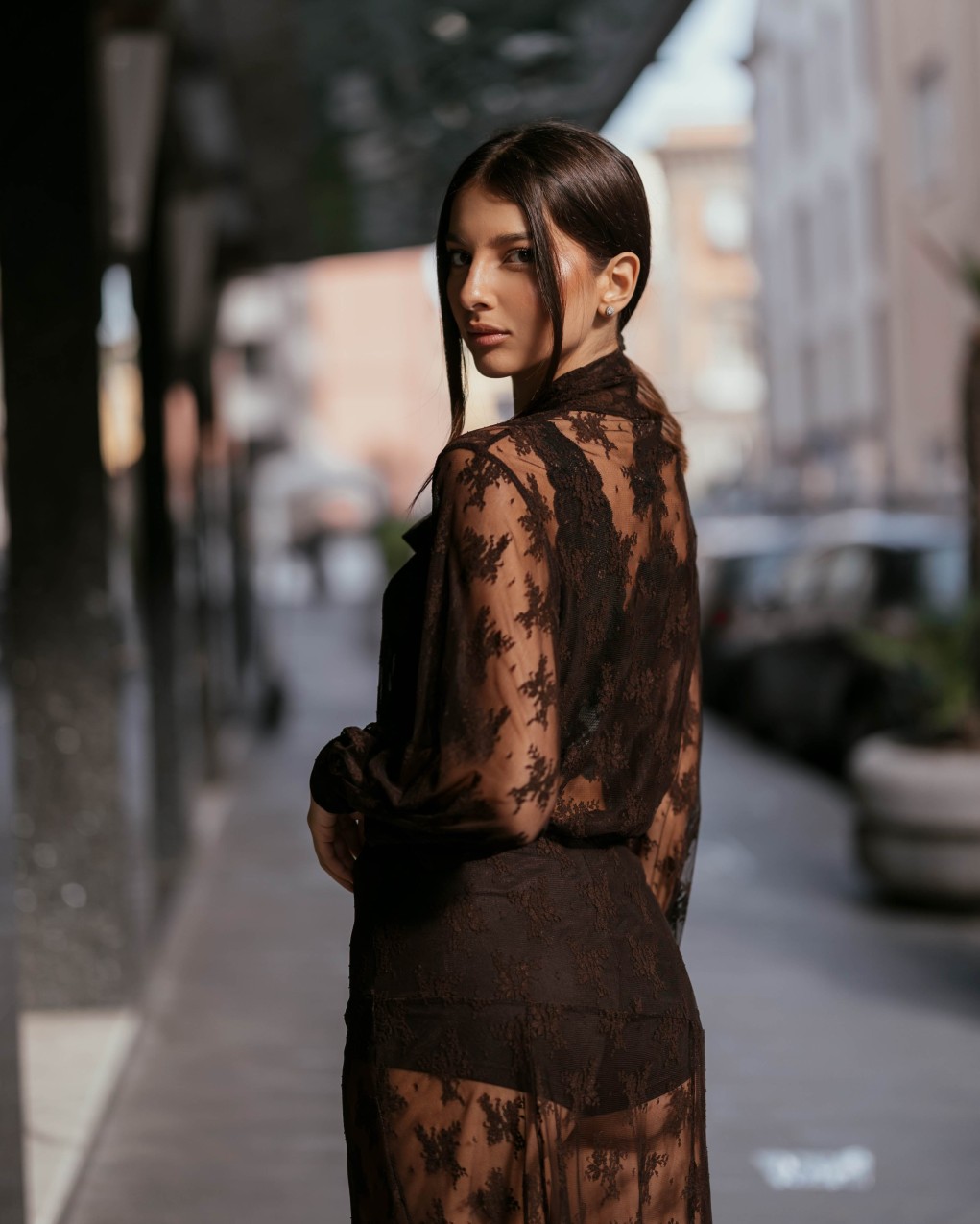 Elegante camicia in pregiato pizzo floreale con trasparenze raffinate e sofisticato fiocco al collo. La silhouette femminile è esaltata dal taglio aderente e dalle maniche a sbuffo, mentre il tessuto in pizzo presenta una delicata texture floreale su tutto il capo.