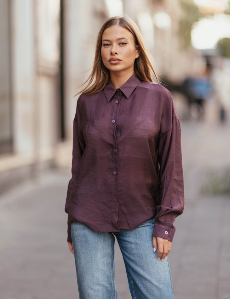 Camicia oversize in pregiato tessuto satinato con taglio contemporaneo e linee pulite. Il design presenta colletto classico, chiusura con bottoni a vista e maniche ampie che donano un tocco di eleganza casual. La vestibilità morbida e la lunghezza versatile permettono di indossarla sia dentro che fuori dai pantaloni, adattandosi perfettamente a diverse occasioni.