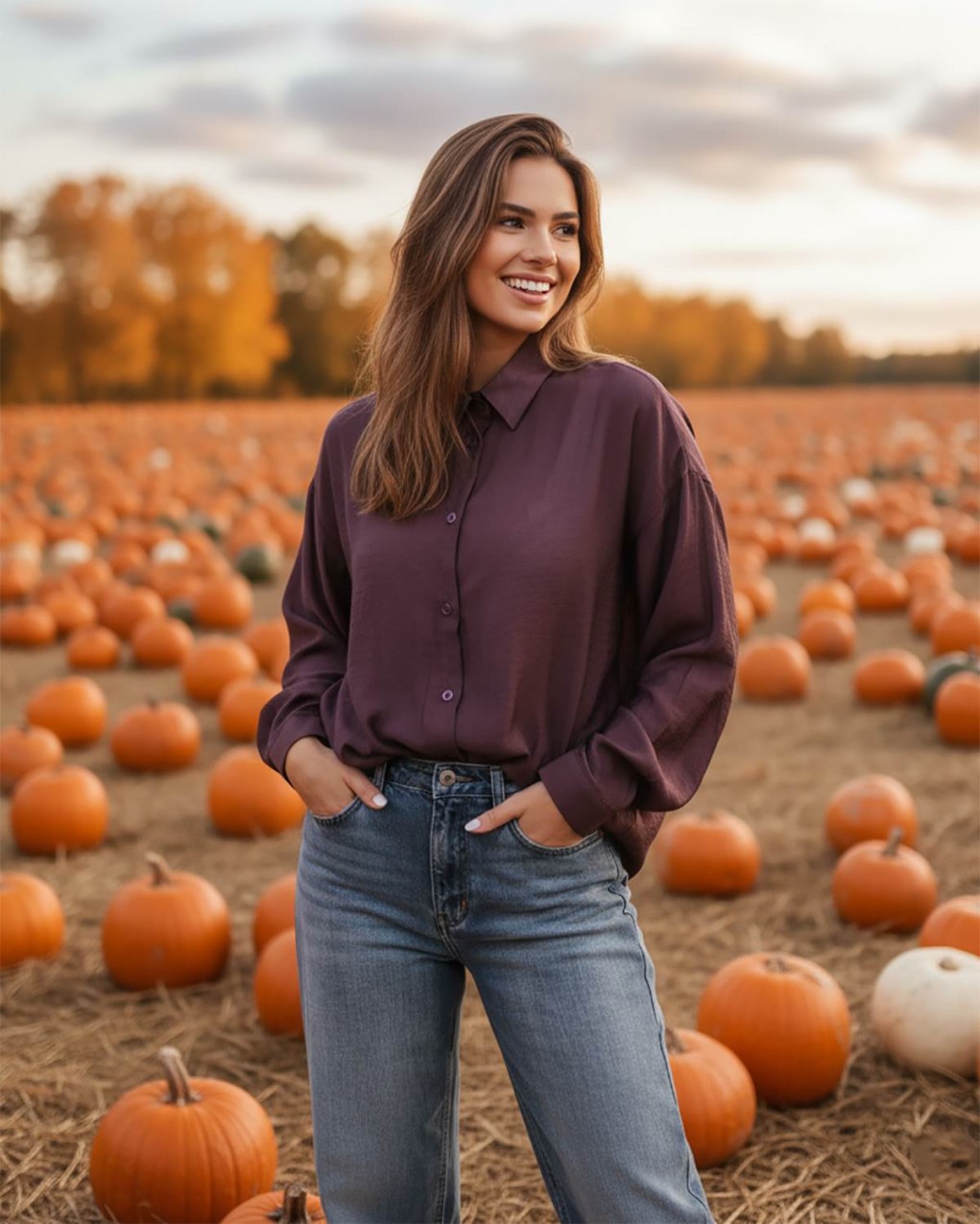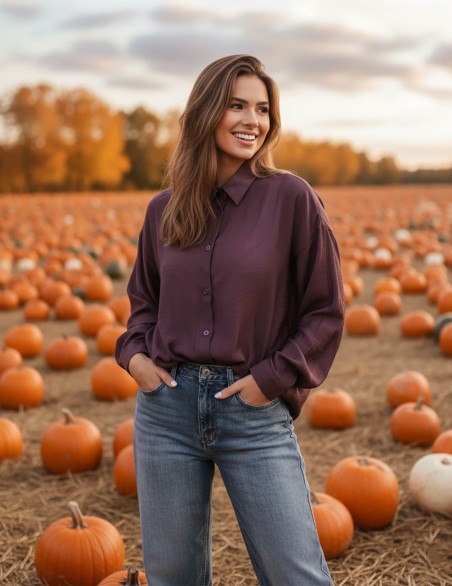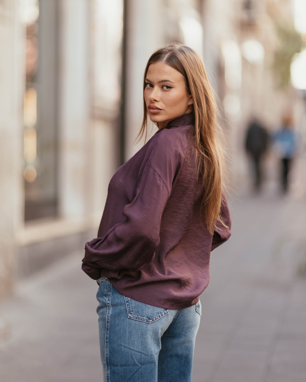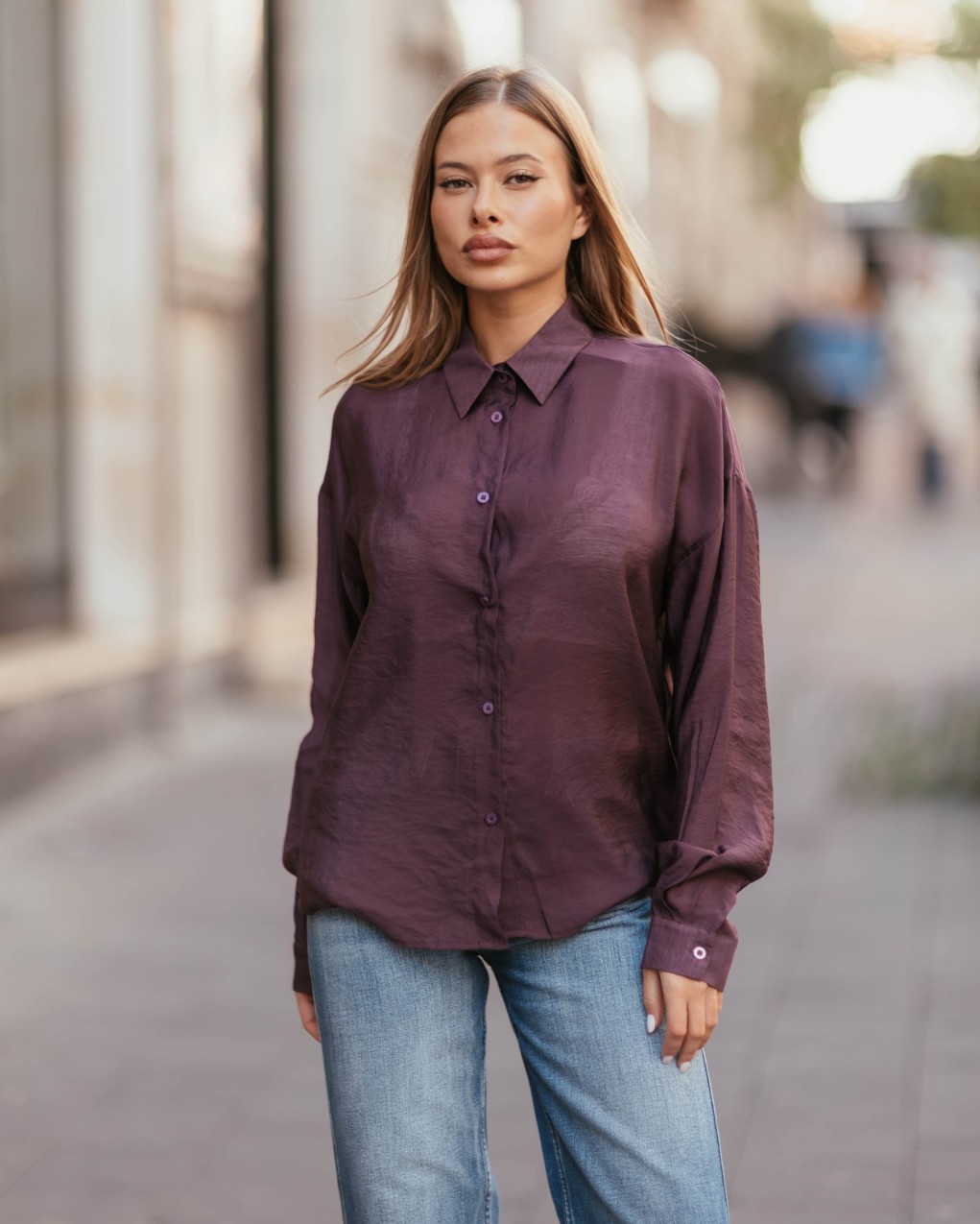 Camicia oversize in pregiato tessuto satinato con taglio contemporaneo e linee pulite. Il design presenta colletto classico, chiusura con bottoni a vista e maniche ampie che donano un tocco di eleganza casual. La vestibilità morbida e la lunghezza versatile permettono di indossarla sia dentro che fuori dai pantaloni, adattandosi perfettamente a diverse occasioni.