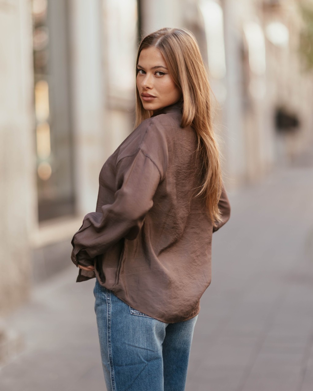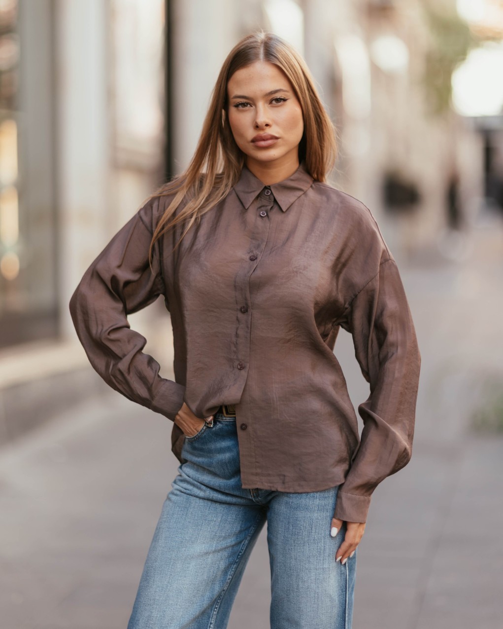 Camicia oversize in pregiato tessuto satinato con taglio contemporaneo e linee pulite. Il design presenta colletto classico, chiusura con bottoni a vista e maniche ampie che donano un tocco di eleganza casual. La vestibilità morbida e la lunghezza versatile permettono di indossarla sia dentro che fuori dai pantaloni, adattandosi perfettamente a diverse occasioni.