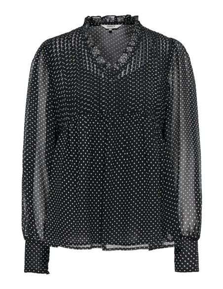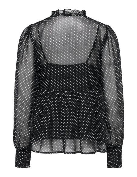 Elegante camicetta a pois trasparente con delicato collo a goccia e raffinati polsini. Il taglio morbido e femminile si adatta perfettamente a ogni silhouette, mentre il tessuto leggero garantisce comfort e traspirabilità. Perfetta per outfit business casual o occasioni speciali, si abbina facilmente sia a pantaloni eleganti che jeans.