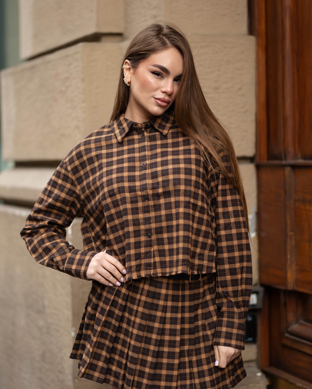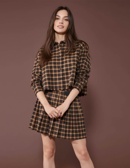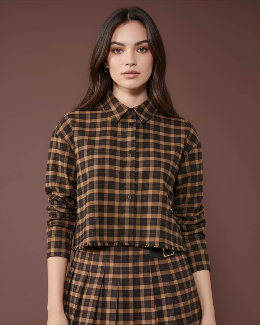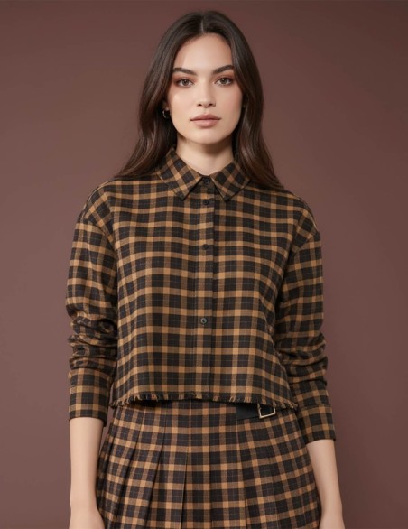Camicia crop in flanella a quadri dal taglio contemporaneo, realizzata in morbido cotone di alta qualità. Il design presenta una vestibilità rilassata con maniche lunghe, colletto classico e orlo sfrangiato per un tocco casual-chic. Perfetta da abbinare con gonne coordinate o jeans, questa camicia unisce comfort e stile per un look versatile e alla moda.