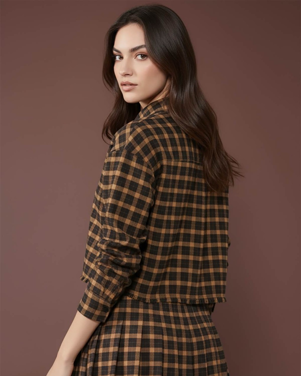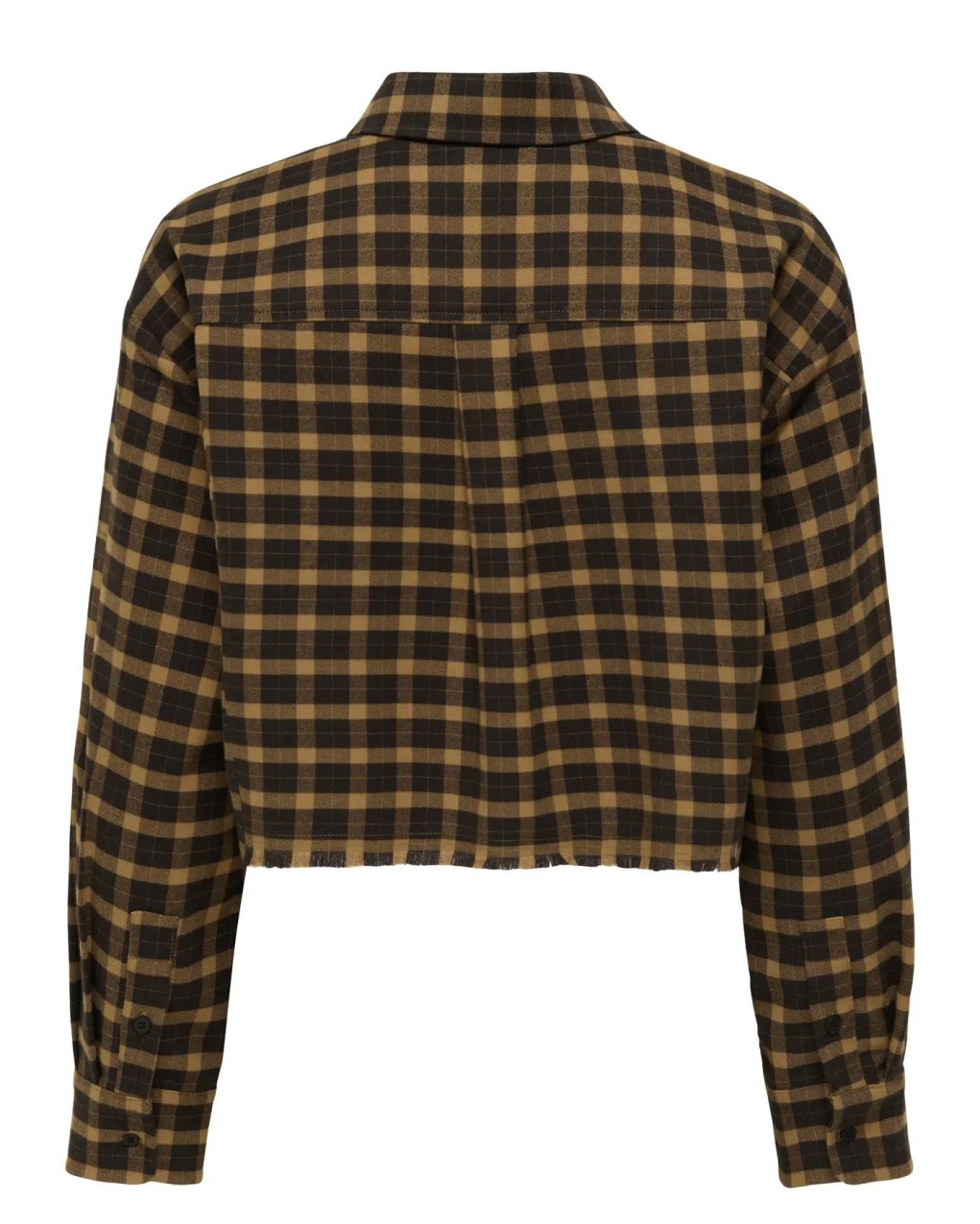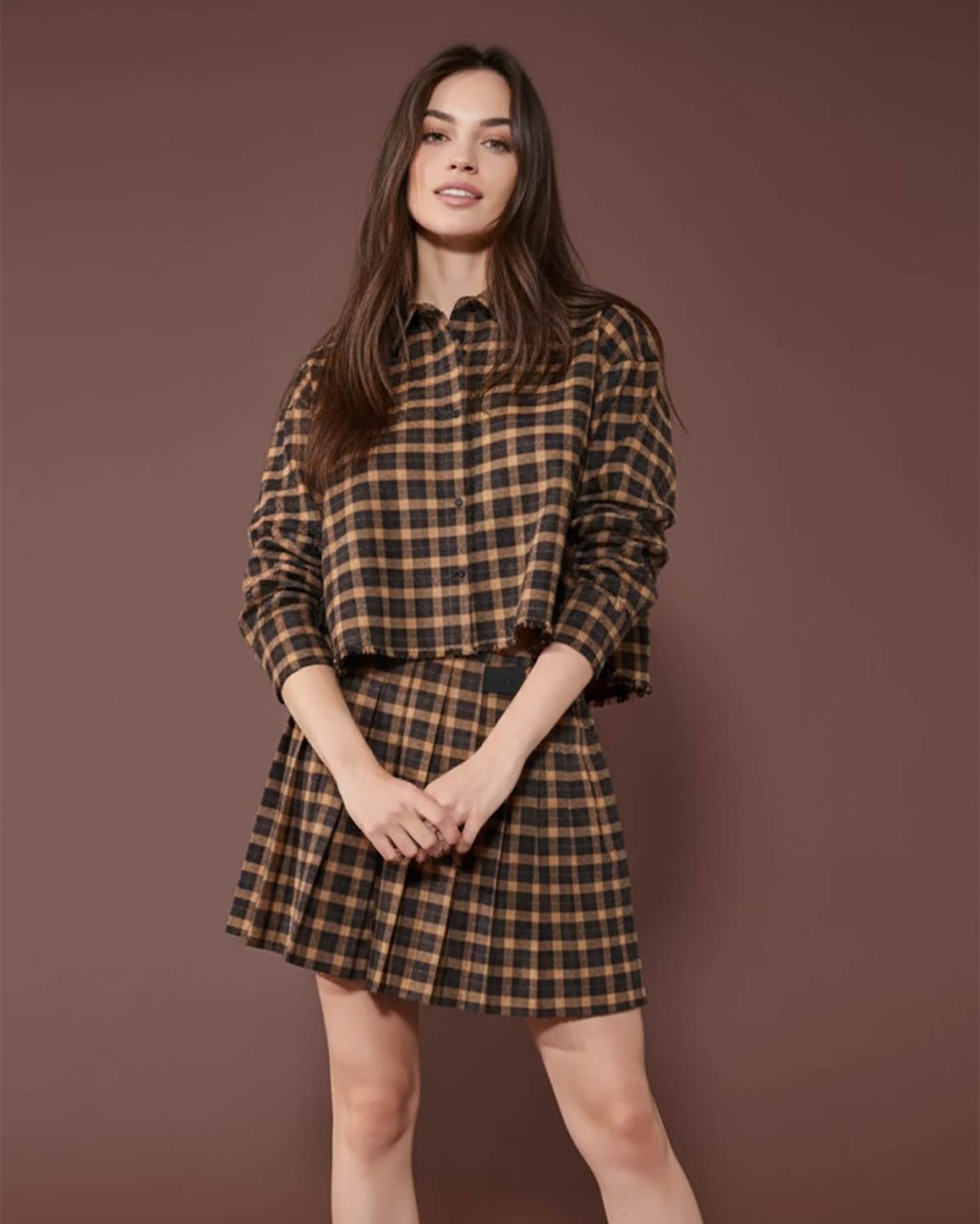 Camicia crop in flanella a quadri dal taglio contemporaneo, realizzata in morbido cotone di alta qualità. Il design presenta una vestibilità rilassata con maniche lunghe, colletto classico e orlo sfrangiato per un tocco casual-chic. Perfetta da abbinare con gonne coordinate o jeans, questa camicia unisce comfort e stile per un look versatile e alla moda.