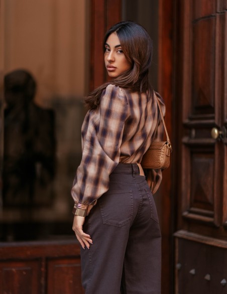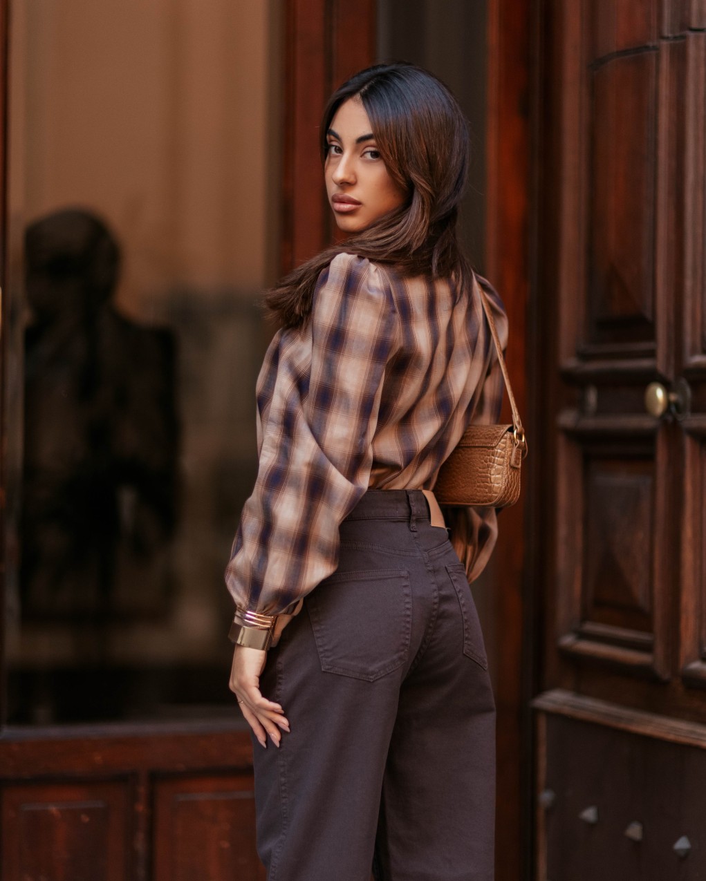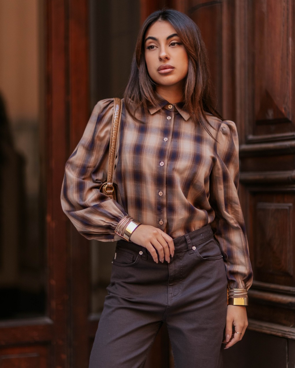 Camicia femminile a quadri dallo stile contemporaneo con bracciali incorporati. Caratterizzata da maniche a palloncino voluminose che conferiscono un look sofisticato e moderno, colletto classico e chiusura frontale con bottoni. Realizzata in tessuto fluido di alta qualità con fantasia check, offre una vestibilità regolare che valorizza la silhouette mantenendo il comfort per un utilizzo versatile dal casual all'elegante.