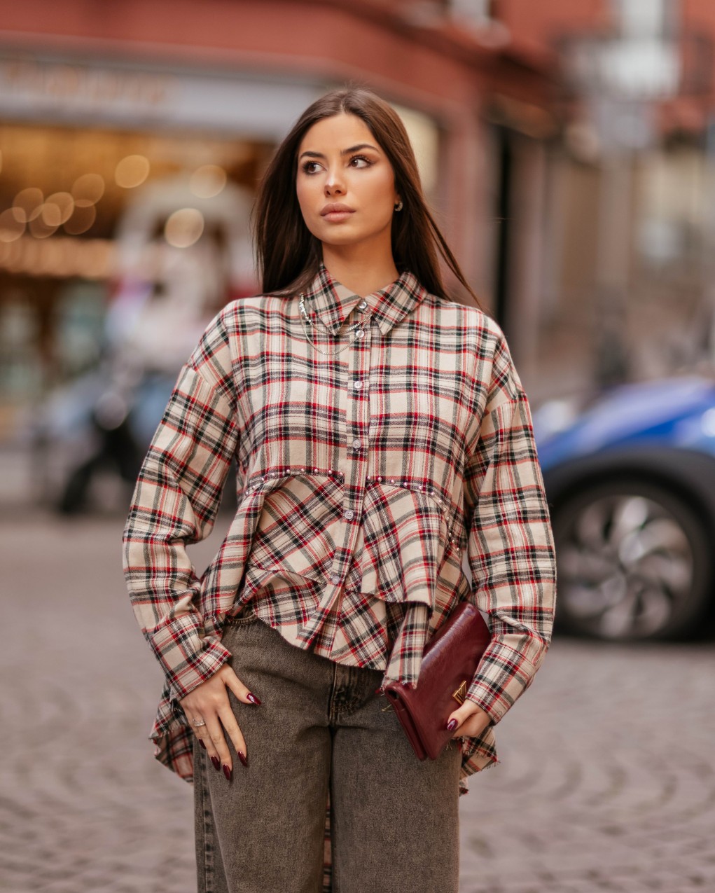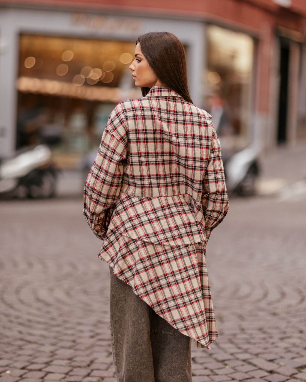 in stile oversize caratterizzata da un elegante motivo a quadri tartan. Il design presenta colletto classico con bottoni frontali e una distintiva balza asimmetrica sul davanti che aggiunge movimento e personalità al capo. Realizzata in tessuto morbido e confortevole, offre una vestibilità ampia e rilassata, perfetta per un look casual-chic contemporaneo.