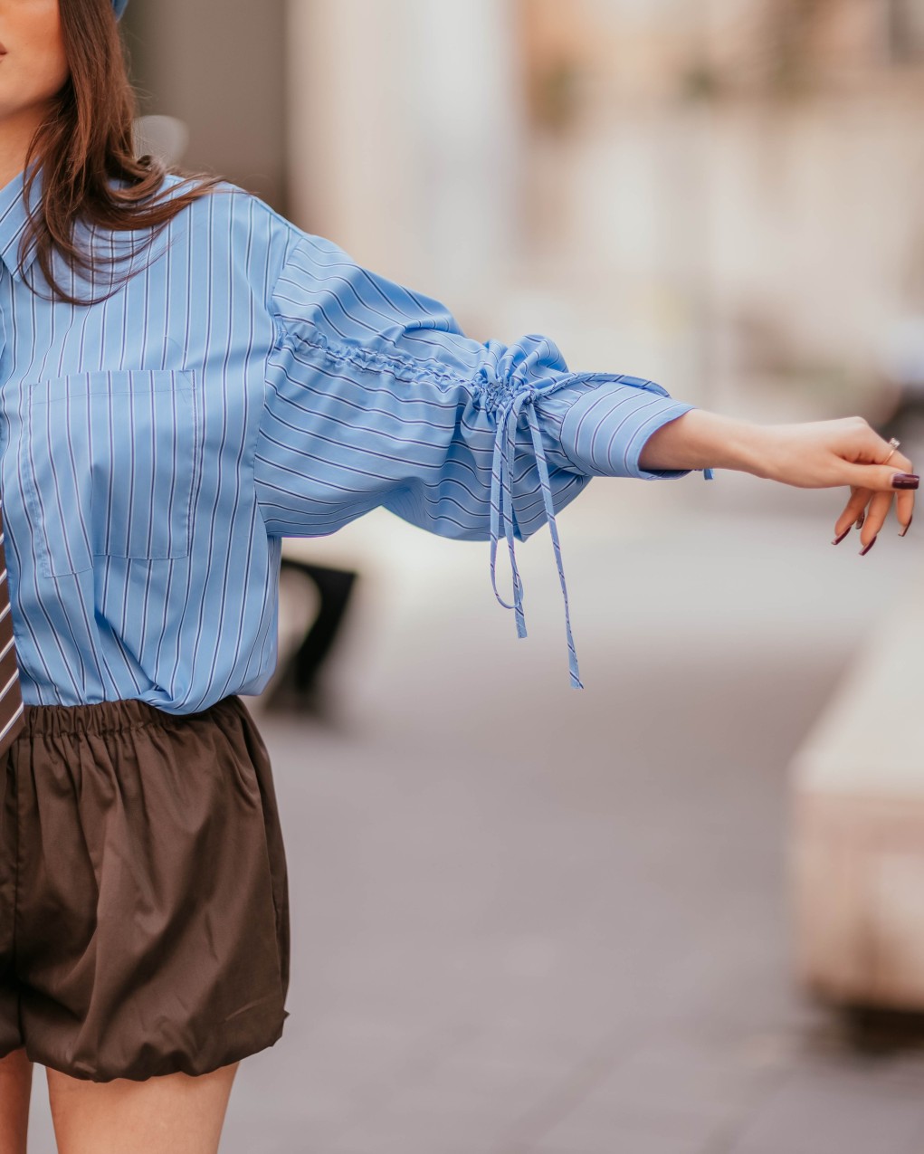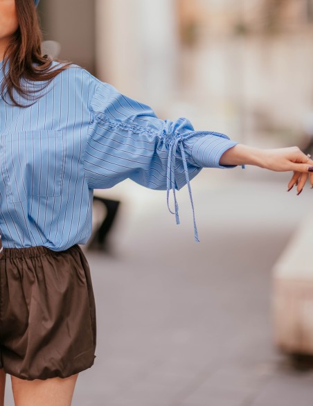 Camicia donna dallo stile contemporaneo con elegante motivo a righe verticali e cravatta. Caratterizzata da maniche a palloncino voluminose con dettagli arricciati e laccetti regolabili ai polsi, che conferiscono un tocco femminile e sofisticato. Realizzata in tessuto fluido di alta qualità, presenta colletto classico e chiusura frontale con bottoni. La vestibilità è comoda e moderna, perfetta per outfit casual-chic o look più strutturati da ufficio.
