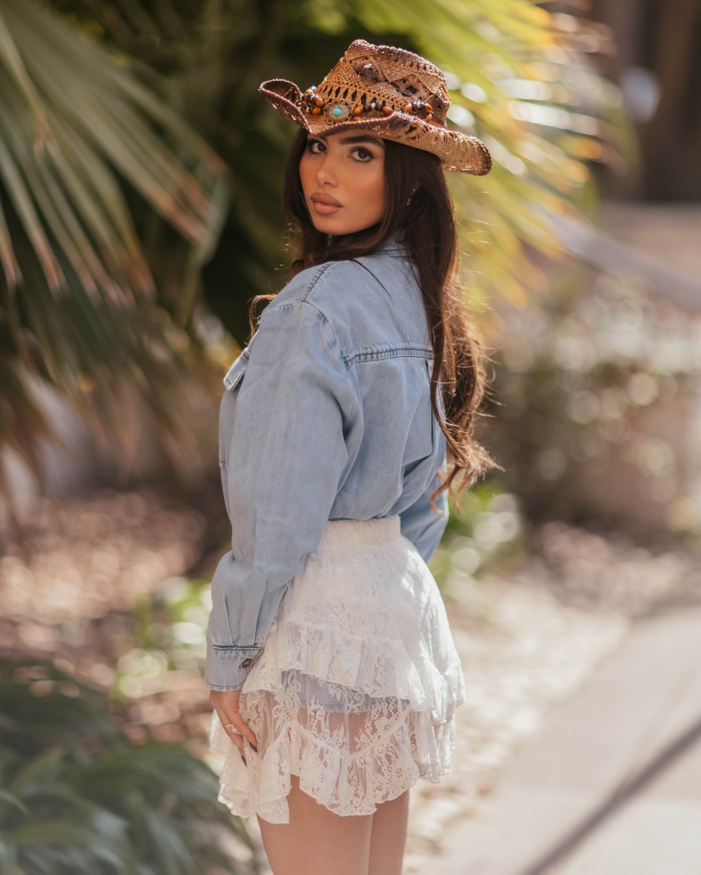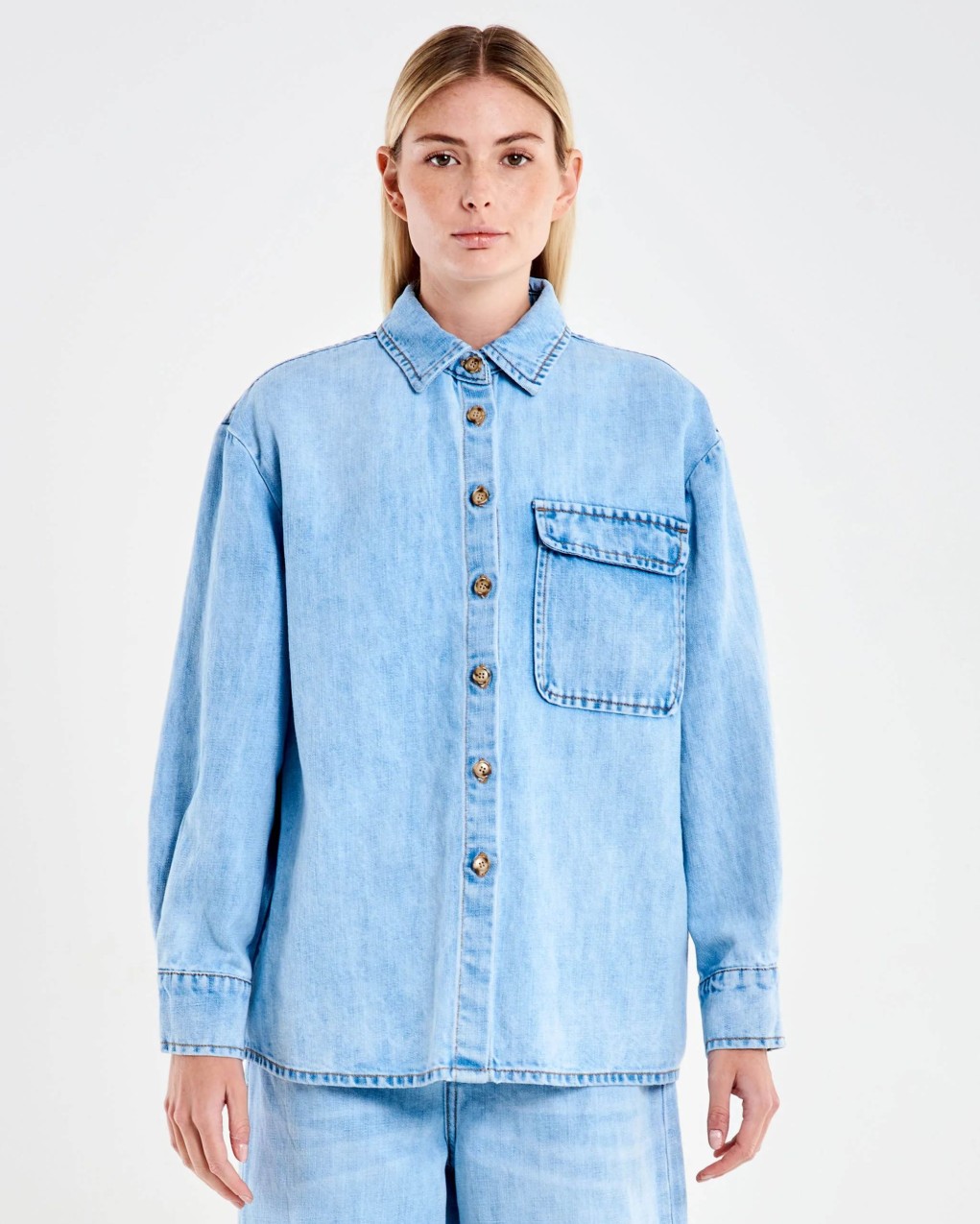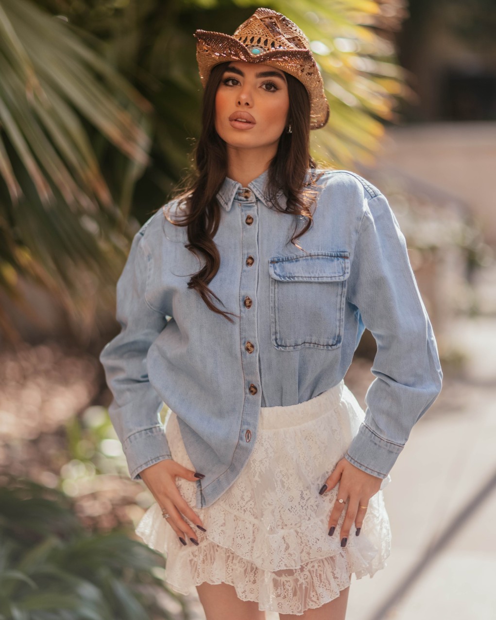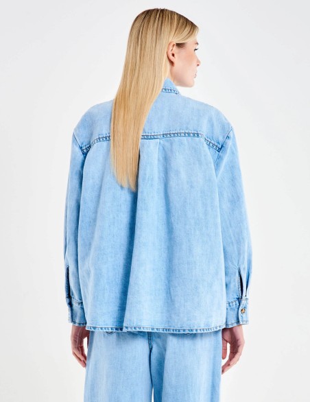 Camicia denim da donna dallo stile casual-chic, perfetta per look versatili tutto l'anno. Realizzata in tessuto denim di qualità, presenta classica chiusura frontale con bottoni, colletto strutturato e pratica tasca sul petto. Le maniche lunghe e il taglio regolare garantiscono comfort e vestibilità ottimale. Capo essenziale che si abbina facilmente a pantaloni, gonne e shorts per outfit casual o più ricercati.