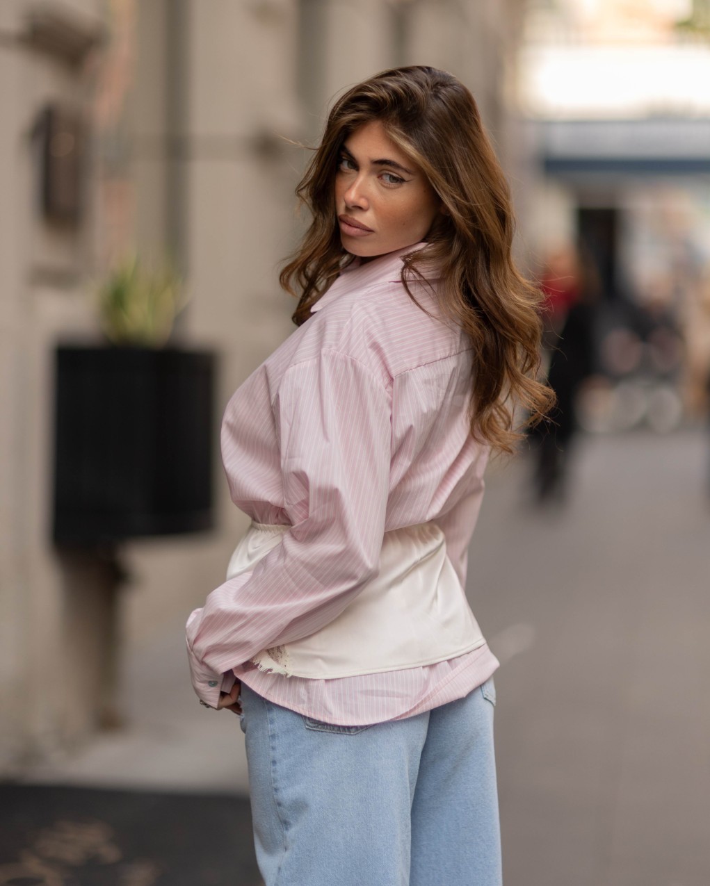 Camicia da donna dallo stile classico e raffinato, caratterizzata da una texture a righe sottili. Il design presenta colletto tradizionale, chiusura con bottoni frontali e maniche lunghe, arricchito da un elegante inserto in raso e pizzo decorativo sulla parte frontale. Realizzata in tessuto di qualità per garantire comfort e praticità. La vestibilità è regolare con linea morbida, ideale per look sia casual che business casual.