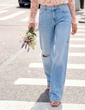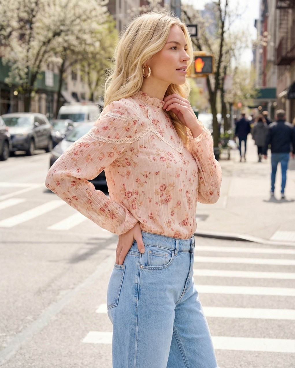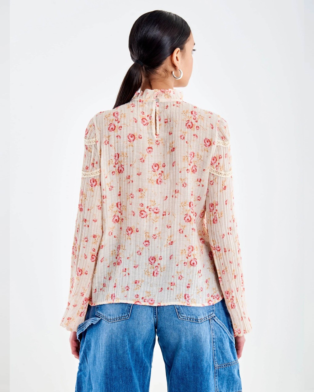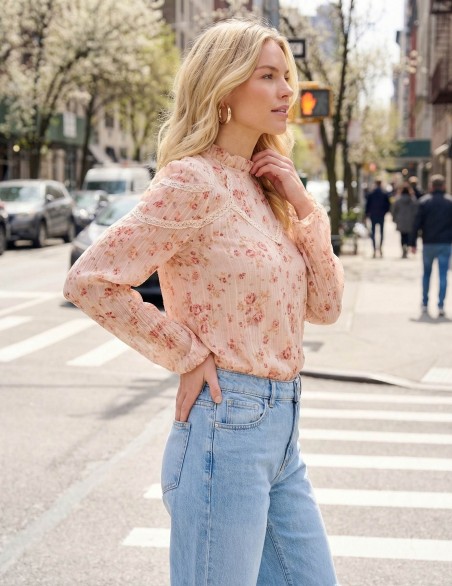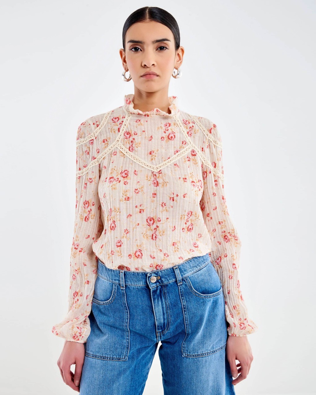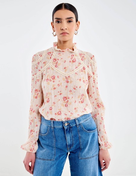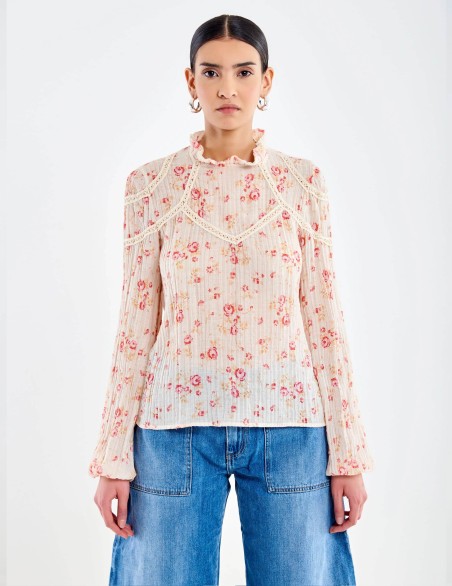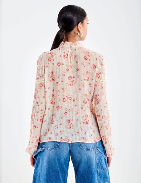 Camicia maniche lunghe con collo alto. Dettaglio fantasia fiorellini e dettagli di nastri traforati che decorano le spalle e lo scollo. Chiusura posteriore con bottoncino. Elastico su polsi.