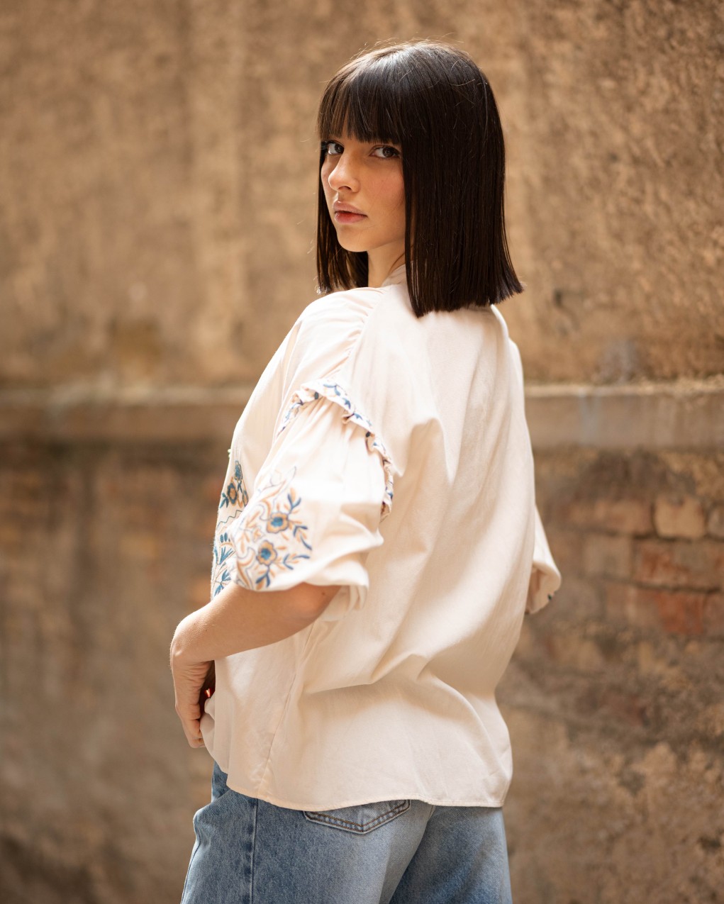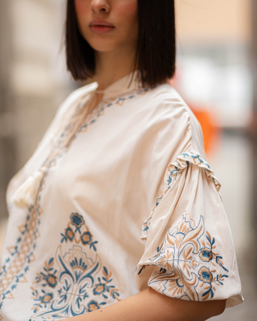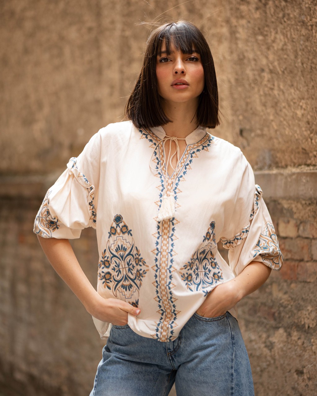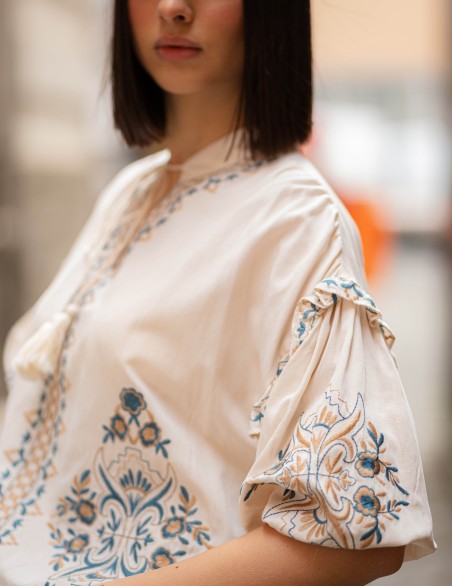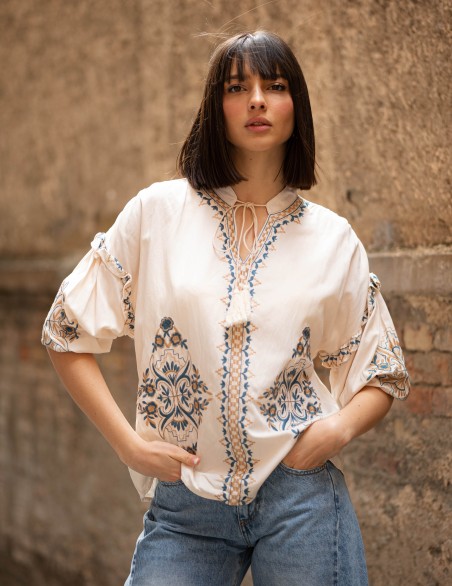 Blusa boho-chic in tessuto leggero con ricami decorativi etnici sul davanti e lungo le maniche. Caratterizzata da scollo con allacciatura a cordoncino, maniche a tre quarti voluminose con dettaglio arricciato e vestibilità ampia e confortevole. Realizzata in materiale morbido e traspirante, ideale per look casual-eleganti. Il design oversize garantisce libertà di movimento e uno stile rilassato ma raffinato.