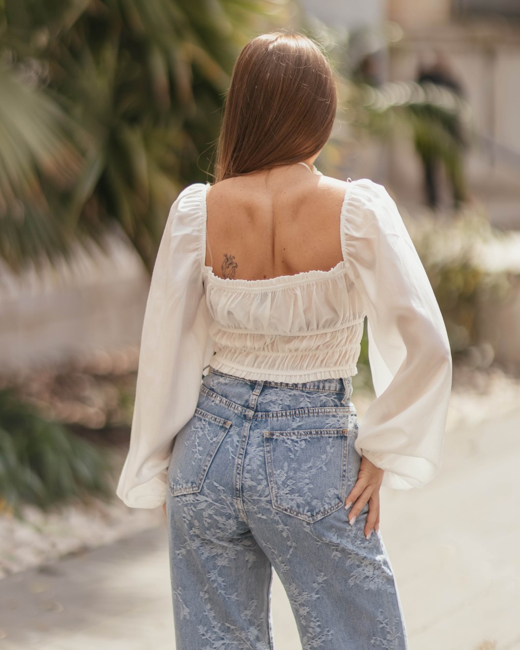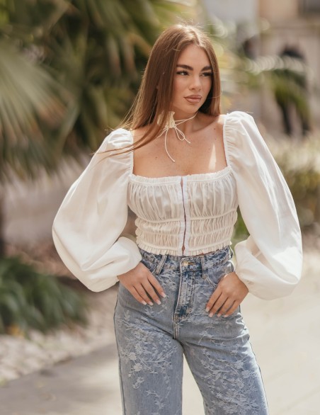Camicia Top corto femminile in stile romantico con scollo quadrato e maniche a palloncino voluminose. Realizzato in tessuto leggero e fluido, presenta dettagli arricciati sul corpetto e chiusura frontale con gancetti. Le maniche lunghe con elastico ai polsi creano un effetto bouffant di tendenza. Vestibilità regolare con vita corta, ideale da abbinare a pantaloni o gonne a vita alta per un look femminile e sofisticato.
