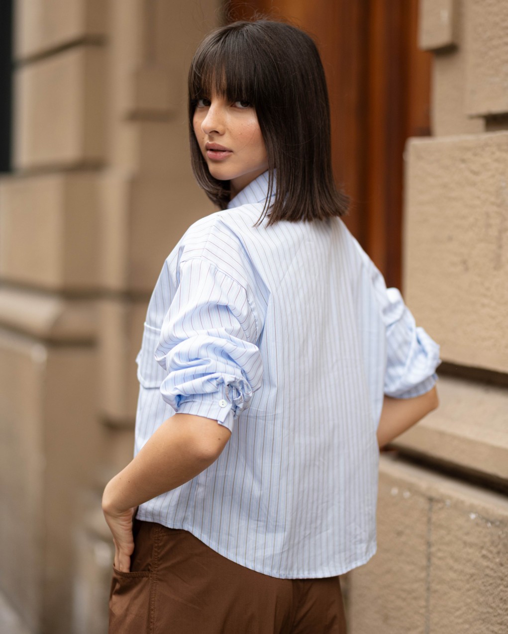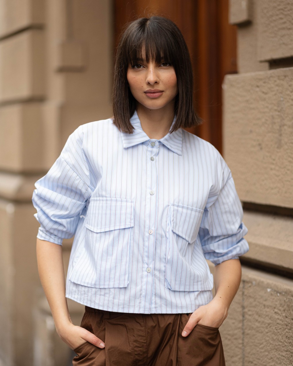 Camicia oversize da donna in tessuto a righe con design contemporaneo e raffinato. Caratterizzata da colletto classico, chiusura frontale con bottoni e due ampie tasche applicate sul petto per un tocco utility-chic. Realizzata in cotone leggero e traspirante, ideale per la mezza stagione. La vestibilità ampia e rilassata garantisce comfort e movimento, perfetta per look casual-eleganti da abbinare a pantaloni o jeans.
