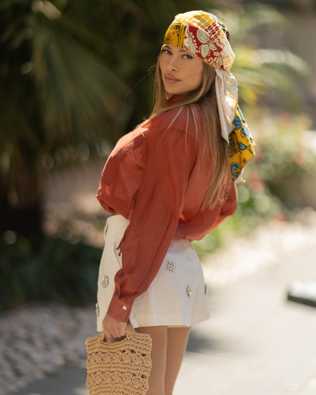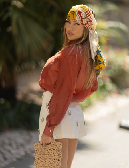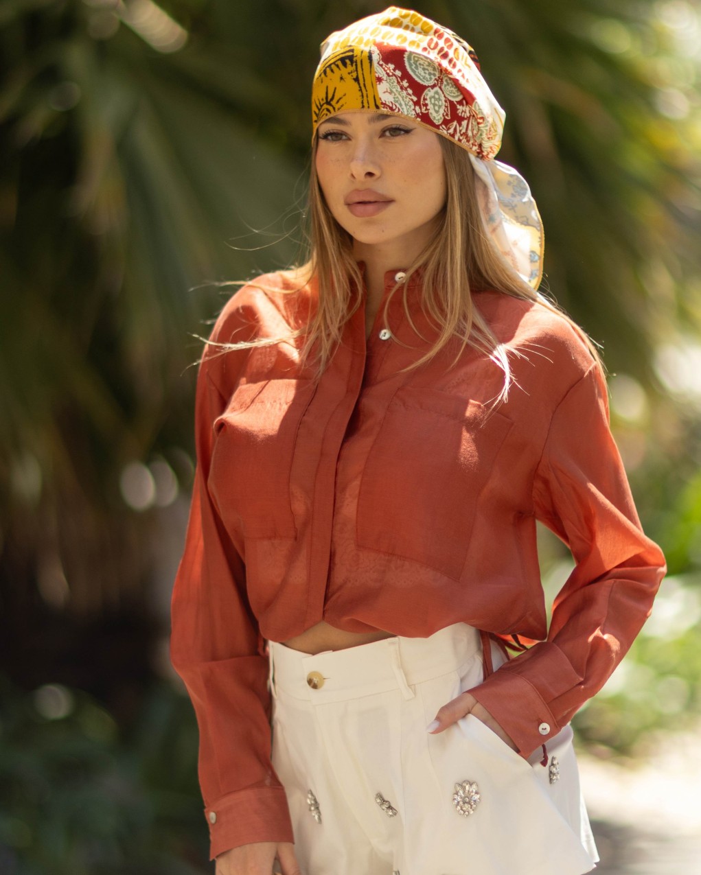 Blusa donna in organza. Modello con collo alla coreana e chiusura frontale con bottoni nascosti, realizzato in tessuto leggero e semitrasparente dall?effetto lucido. Presenta maniche lunghe con polsini e bottoni, tasche applicate sul davanti e fondo regolabile con coulisse per una vestibilità personalizzata.