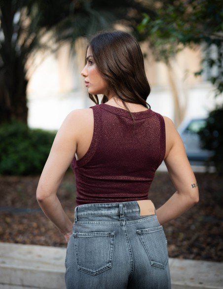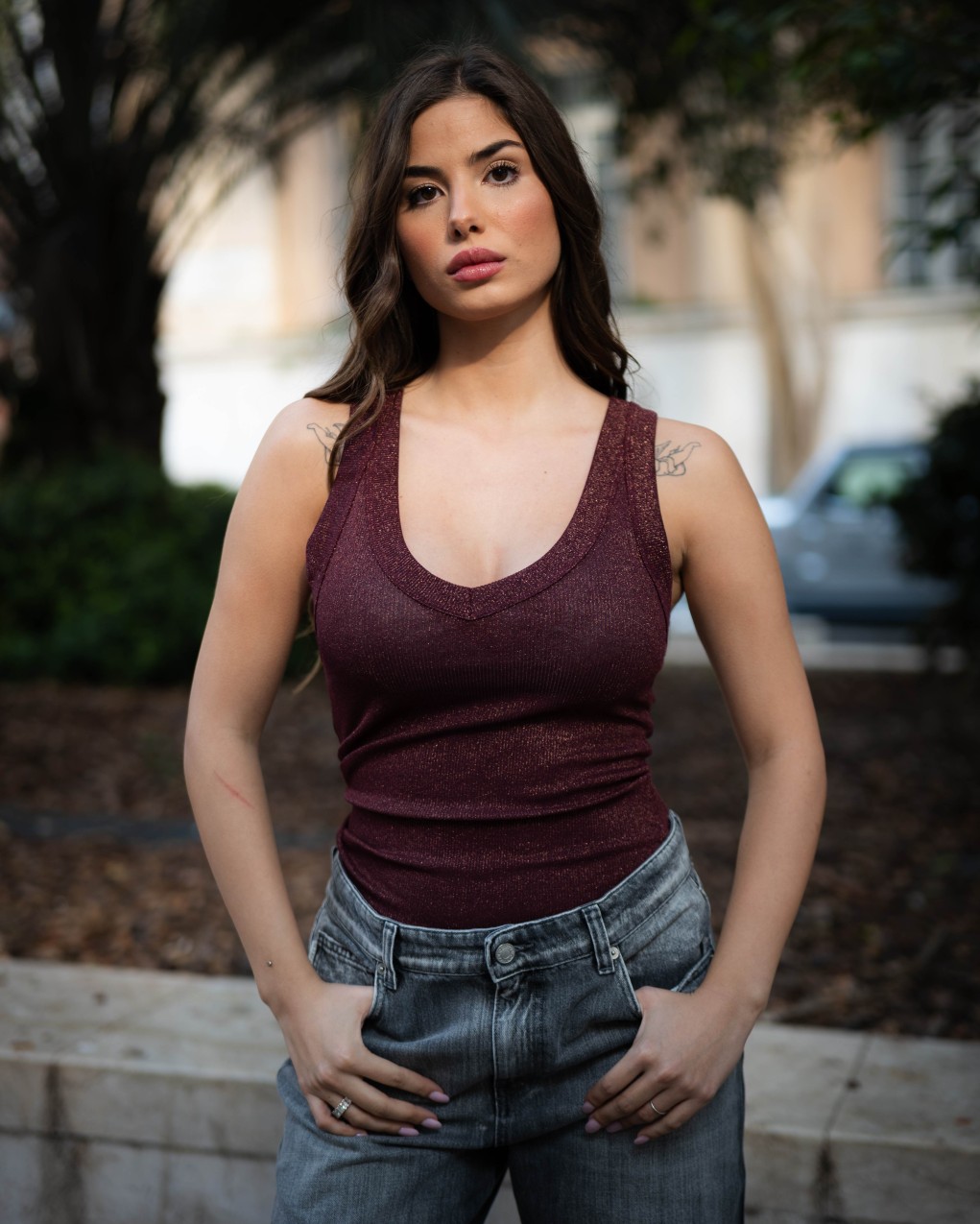 Canotta in tessuto lurex brillante, caratterizzata da uno scollatura a V che dona femminilità e stile al capo. La trama scintillante aggiunge un tocco glamour perfetto per look da sera o occasioni speciali.