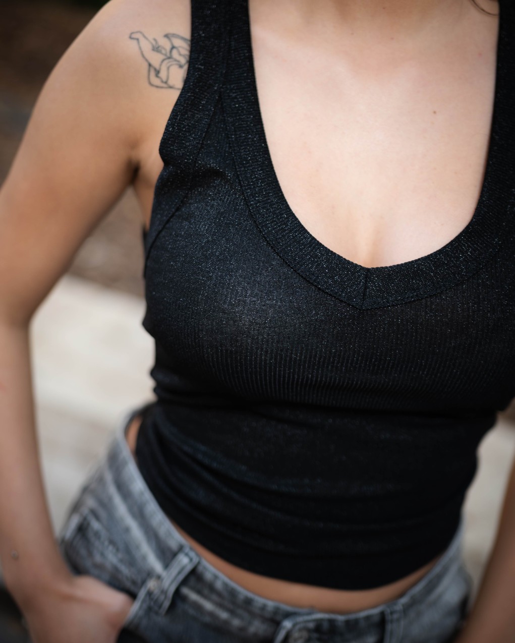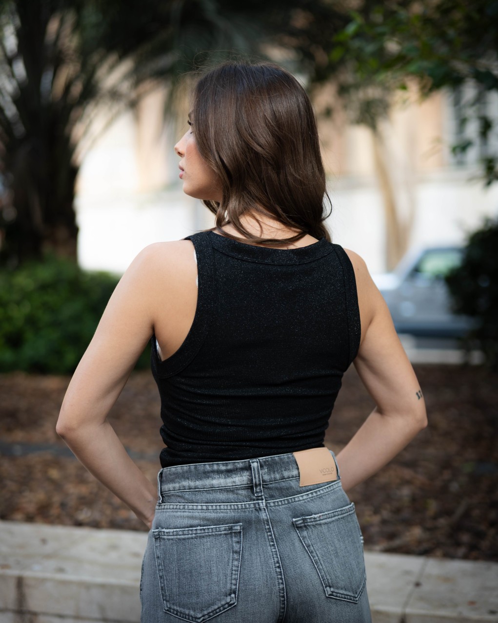 Canotta in tessuto lurex brillante, caratterizzata da uno scollatura a V che dona femminilità e stile al capo. La trama scintillante aggiunge un tocco glamour perfetto per look da sera o occasioni speciali.