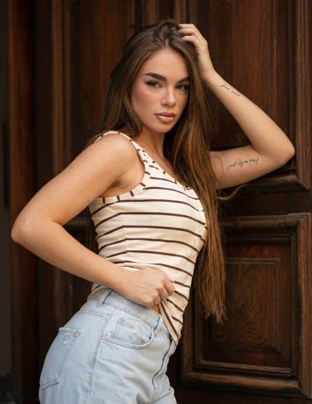Canotta a coste con motivo a righe orizzontali, perfetto per un look casual-chic primaverile ed estivo. Presenta una scollatura quadrata con dettaglio arricciato e pratica chiusura frontale con bottoni decorativi. Realizzato in tessuto stretch confortevole che garantisce vestibilità aderente e valorizzante. Ideale da abbinare a jeans o pantaloni per outfit quotidiani versatili e femminili.