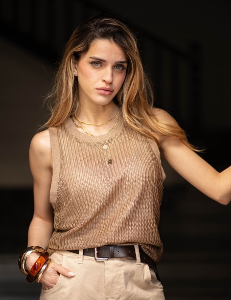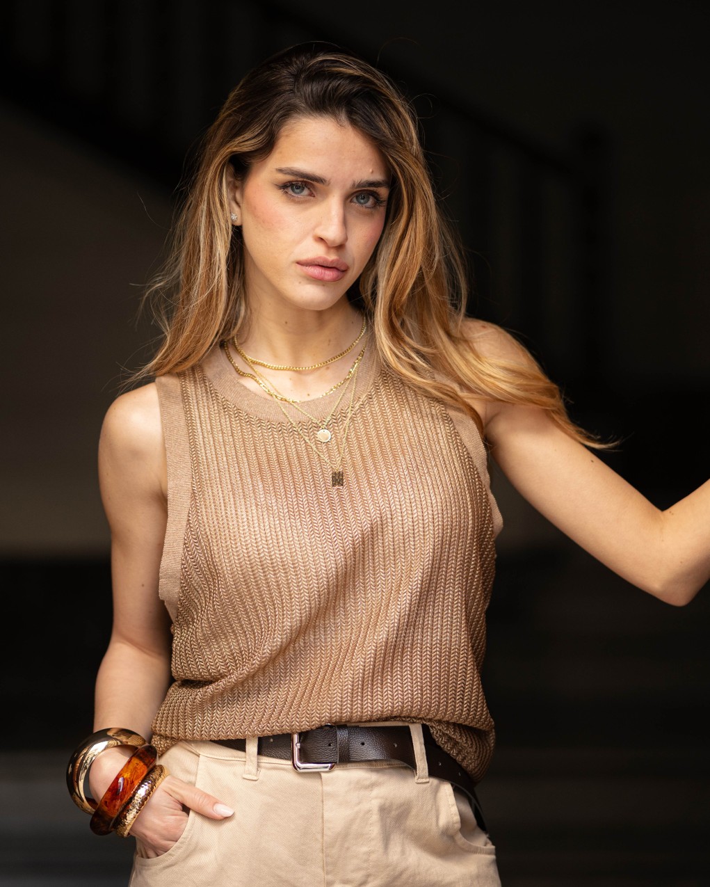 Top smanicato in maglia con lavorazione a coste, perfetto per un look casual-chic contemporaneo. Realizzato in filato morbido e traspirante, presenta girocollo classico e design sleeveless che valorizza la silhouette. La texture a costine verticali dona movimento e struttura al capo, mentre la vestibilità regolare garantisce comfort e versatilità per outfit quotidiani o da layering. Ideale da abbinare con pantaloni sia casual che eleganti per ogni occasione.