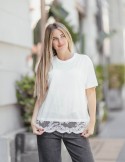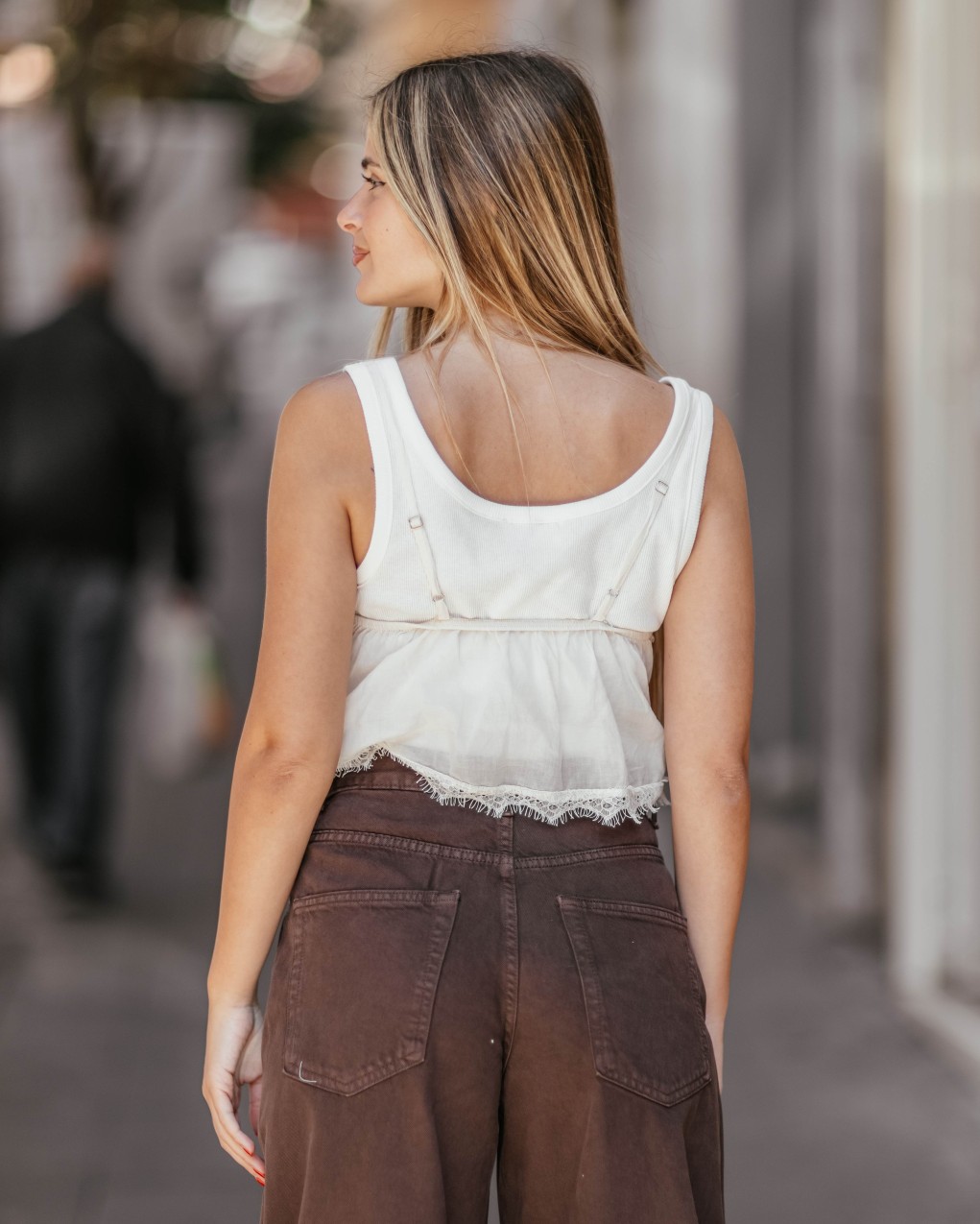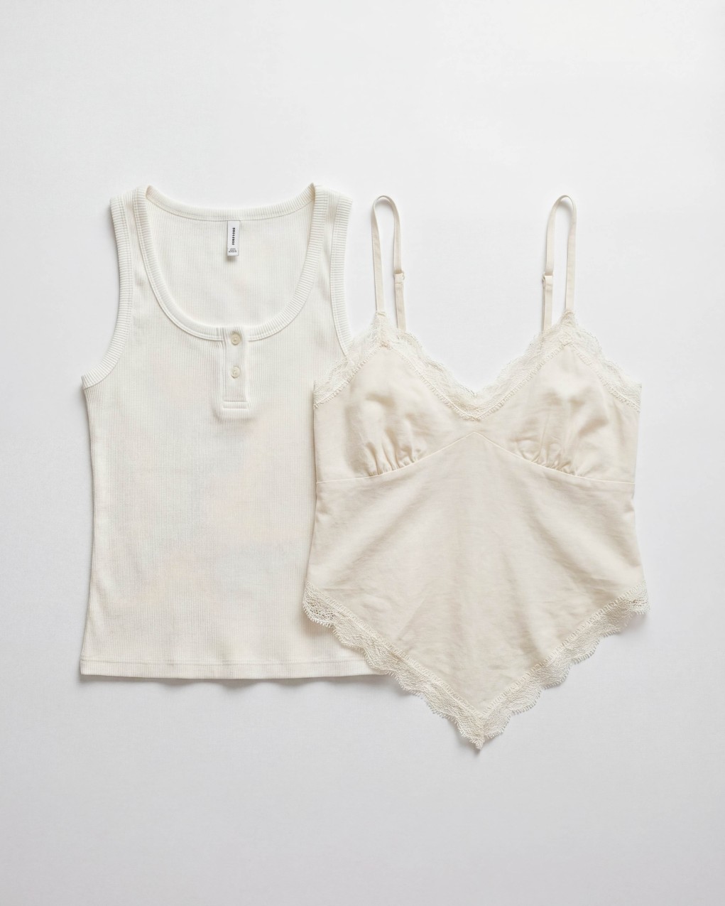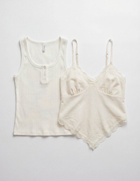 Canotta color panna composta da due modelli separabili, una canotta basica in maglia a costine con scollo stondato e bottoncini + una canotta con scollo a V e fondo a punta con merletto in pizzo, spalline sottili regolabili. Vestibilità regolare.
