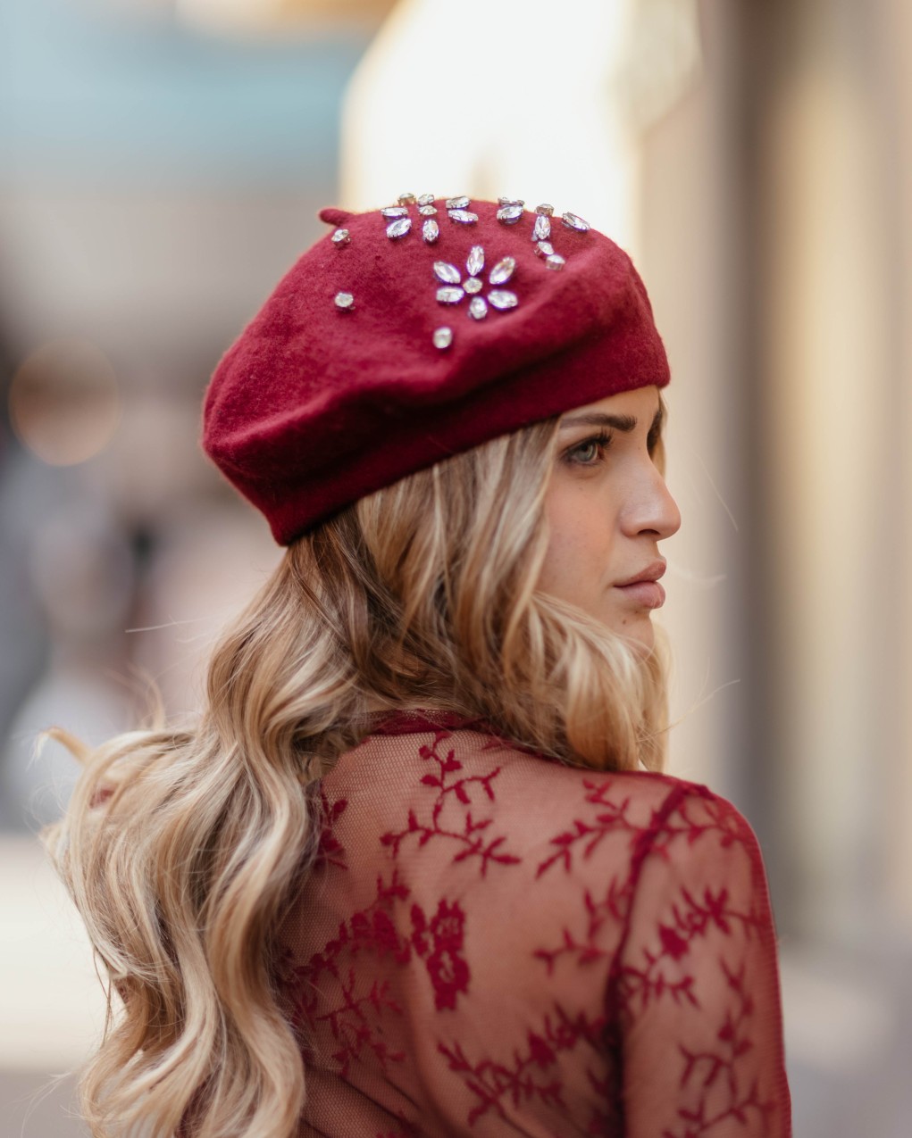 ●Elegante cappello modello basco, ricoperto di scintillanti strass che catturano la luce e aggiungono un tocco glamour a qualsiasi outfit