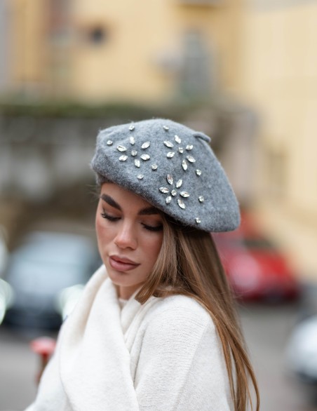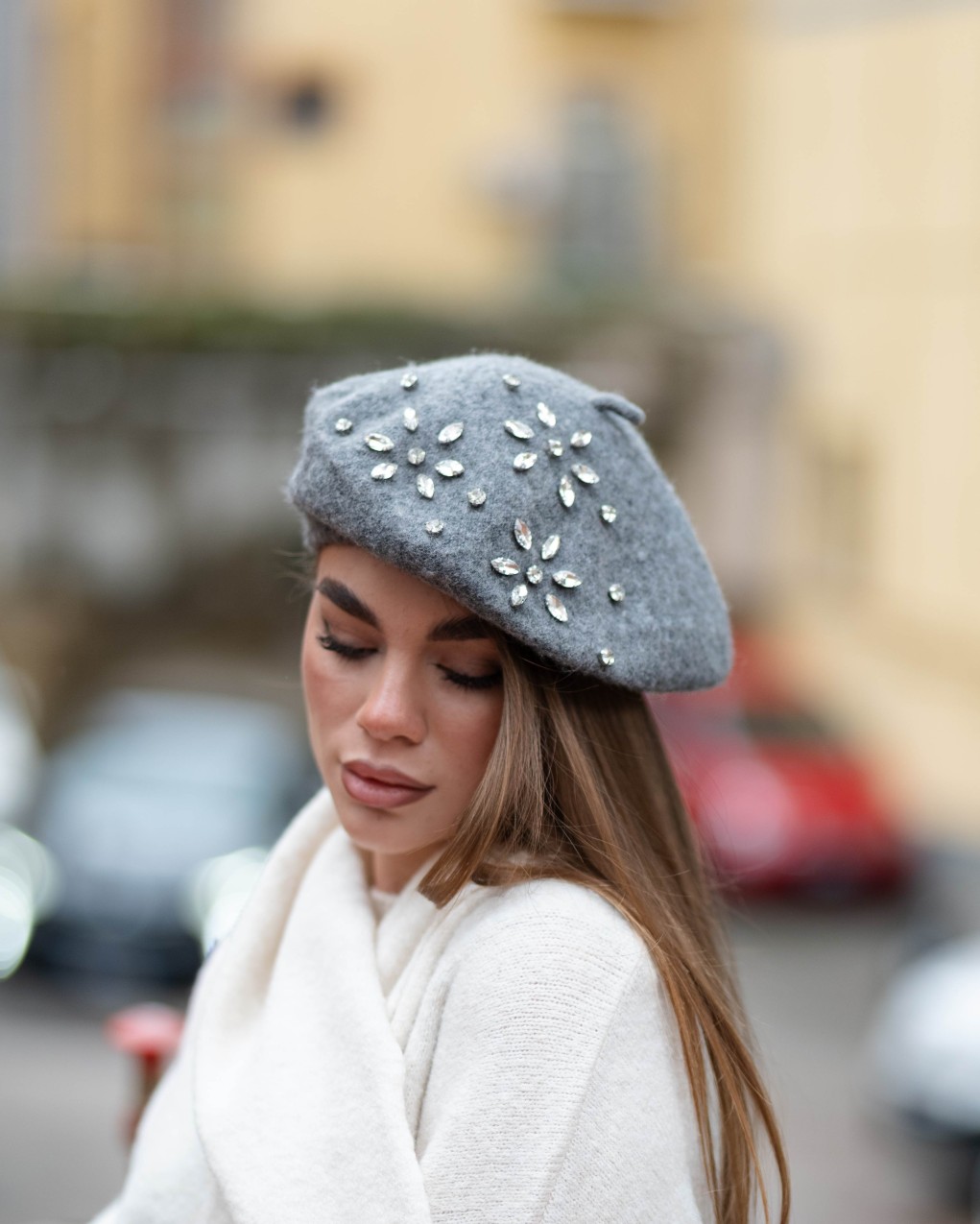 Elegante cappello modello basco, ricoperto di scintillanti strass che catturano la luce e aggiungono un tocco glamour a qualsiasi outfit