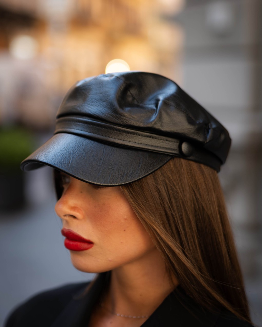 Elegante berretto stile newsboy in morbida pelle sintetica di alta qualità, caratterizzato da una silhouette strutturata con visiera pronunciata. La costruzione a otto pannelli offre una vestibilità confortevole e adattabile, mentre le cuciture rinforzate garantiscono durata nel tempo. Un accessorio versatile che unisce il fascino vintage al comfort contemporaneo.