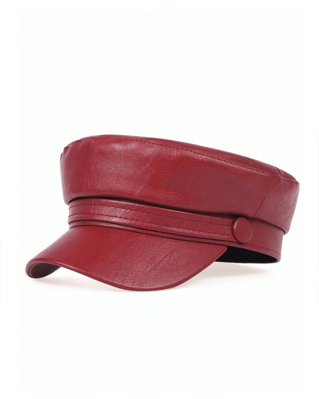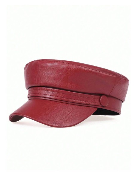 Elegante berretto stile militare/marinaio realizzato in pelle sintetica di alta qualità. Design classico con visiera rigida e fascia decorativa con bottone laterale. La struttura morbida e la vestibilità regolabile garantiscono comfort ottimale per un accessorio senza tempo che completa con stile ogni outfit.