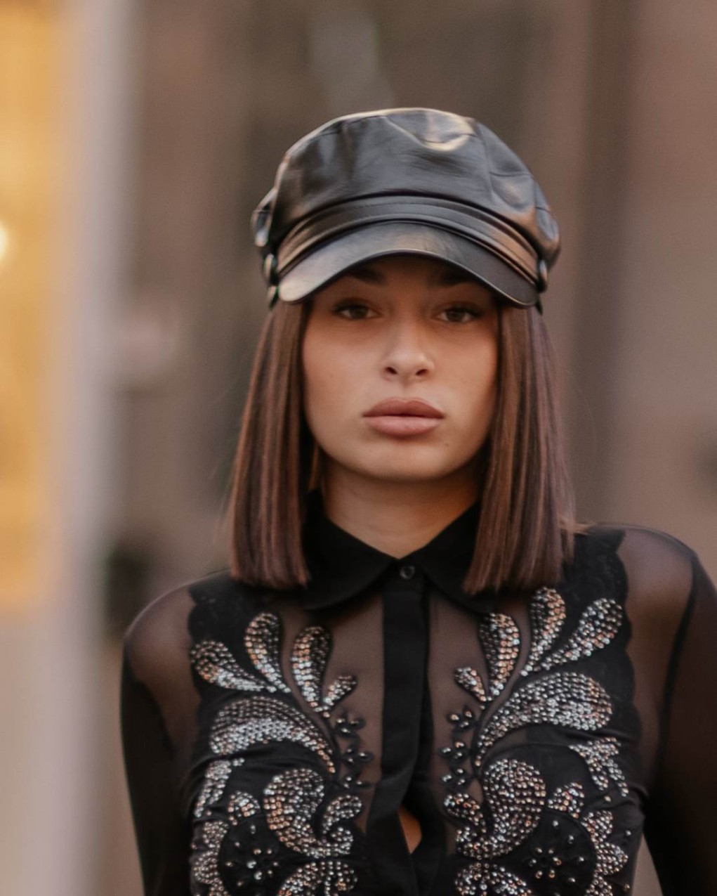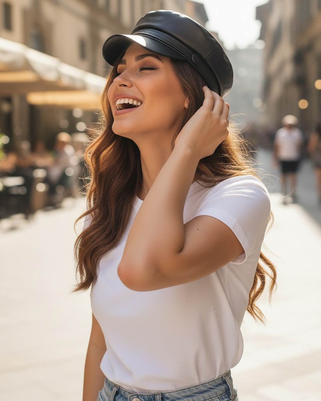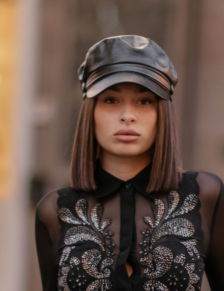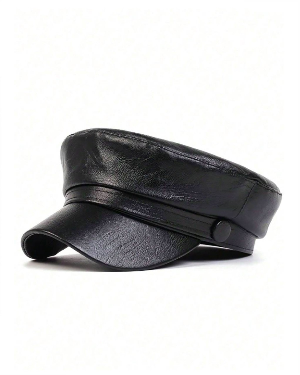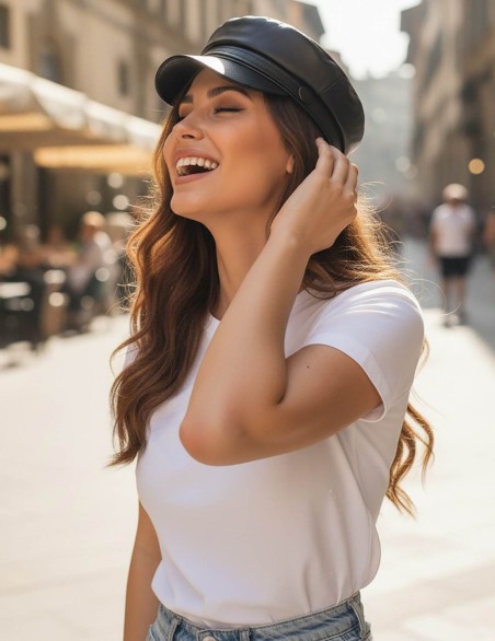 Elegante berretto stile militare/marinaio realizzato in pelle sintetica di alta qualità. Design classico con visiera rigida e fascia decorativa con bottone laterale. La struttura morbida e la vestibilità regolabile garantiscono comfort ottimale per un accessorio senza tempo che completa con stile ogni outfit.