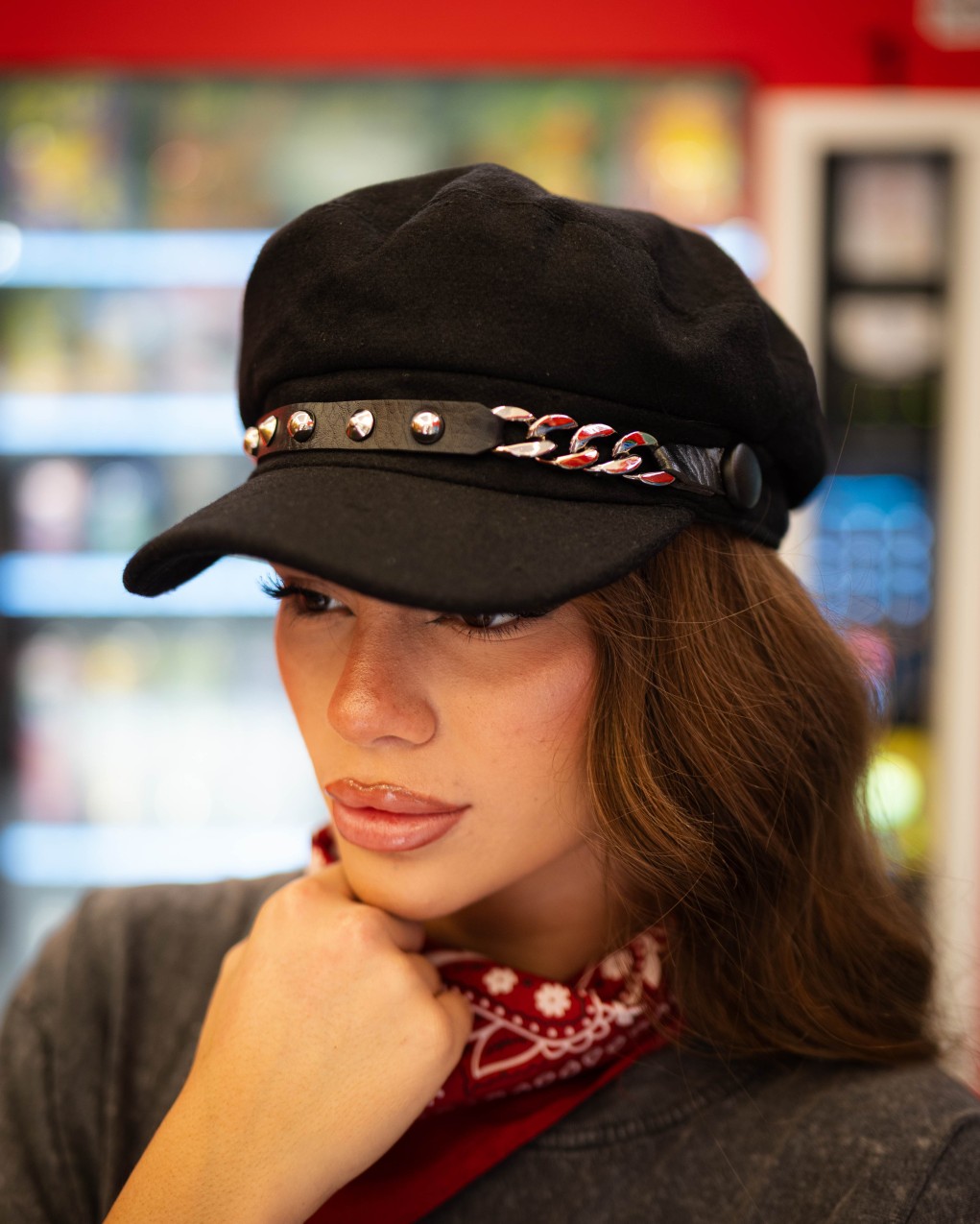Elegante berretto stile baker boy in morbido tessuto scamosciato, impreziosito da una fascia decorativa con borchie metalliche e catena intrecciata. La visiera strutturata e la calzata comoda si adattano perfettamente a diverse misure, mentre il design versatile lo rende ideale sia per look casual che più ricercati. La qualità dei materiali e le finiture artigianali garantiscono resistenza e durata nel tempo.