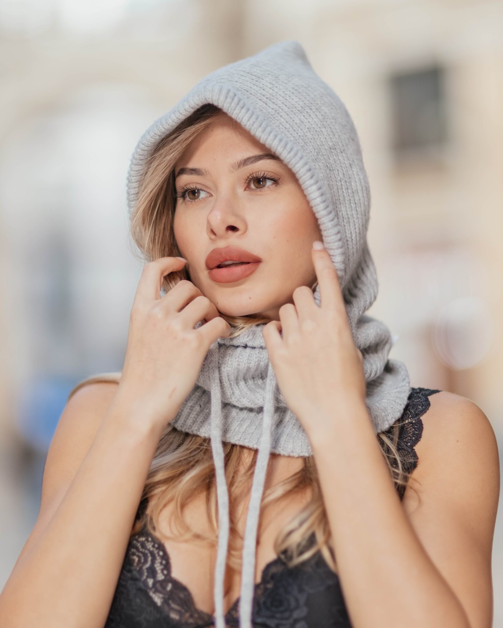 Elegante e pratico, questo cappello balaclava in lana offre comfort e stile per le giornate più fredde. Il design avvolgente protegge sia la testa che il collo, mantenendoti al caldo con un tocco di raffinatezza. Il colore nero versatile si abbina facilmente a qualsiasi outfit, mentre il morbido tessuto in lana garantisce una sensazione di comfort durante tutta la giornata. Perfetto per chi cerca un accessorio trendy e funzionale, adatto sia per la città che per le avventure all’aria aperta