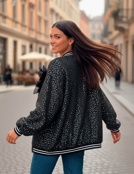 Bomber jacket glamour con finitura glitter all-over e dettaglio fiocco sulla spalla. Realizzato in tessuto strutturato con bordi a costine elasticizzati, presenta una vestibilità oversize perfetta per uno stile casual-chic. La chiusura con zip e le tasche laterali completano questo capo statement ideale per le occasioni speciali.
