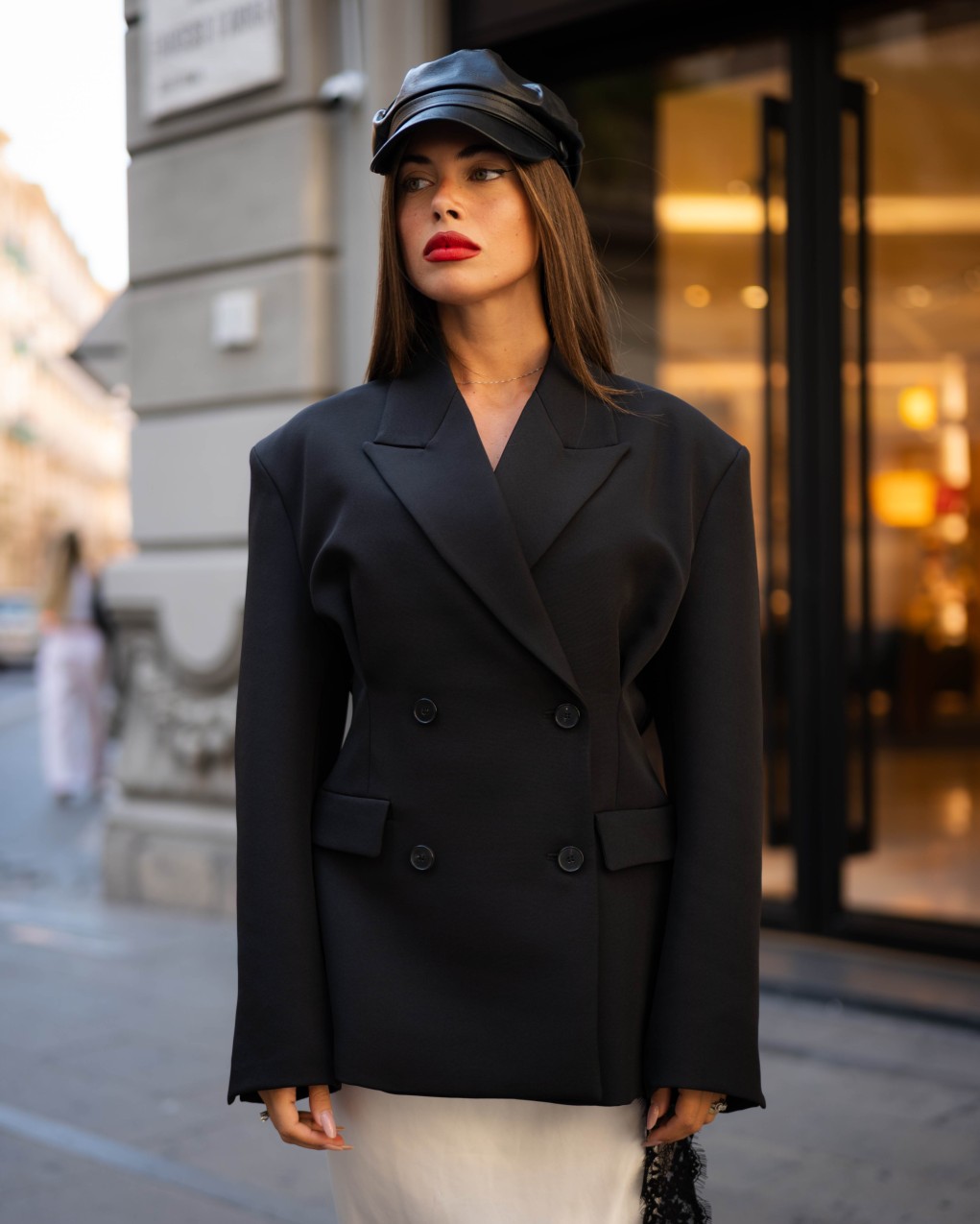 Elegante blazer sartoriale con design strutturato e dettaglio plissettato sul retro. Realizzato in pregiato tessuto di lana con fodera interna, presenta una silhouette moderna caratterizzata da spalle definite e vita sagomata. La lavorazione artigianale e i dettagli raffinati rendono questo capo perfetto per look sofisticati sia formali che casual-chic.