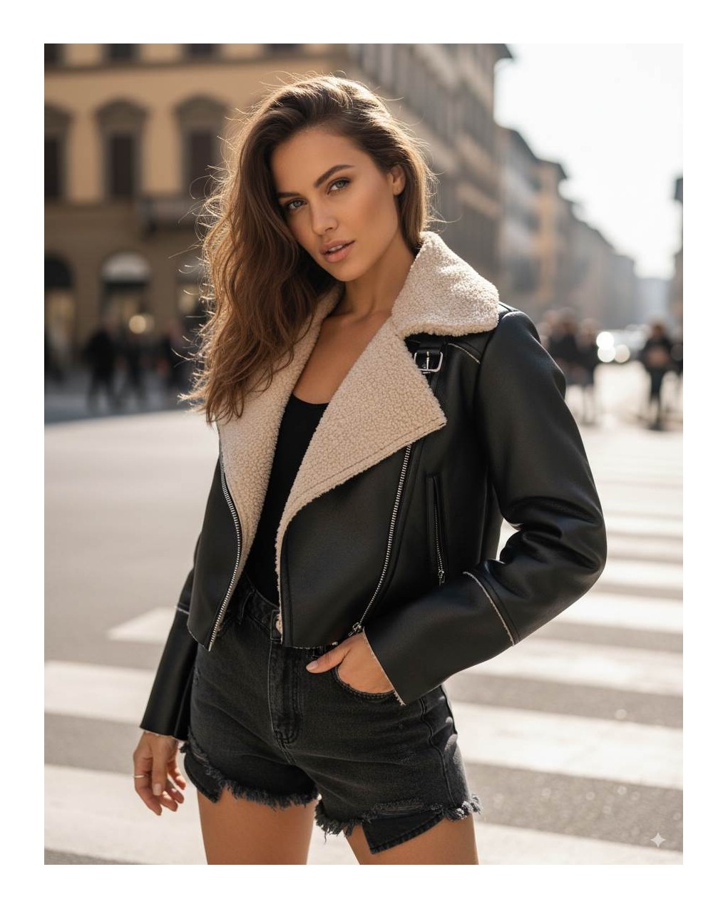 Giacca corta in ecopelle di alta qualità con colletto in morbida pelliccia sintetica e dettagli in shearling a contrasto. Design contemporaneo caratterizzato da cuciture decorative e taglio cropped per una silhouette moderna. La vestibilità aderente e la struttura del capo garantiscono comfort e stile per look casual-chic.