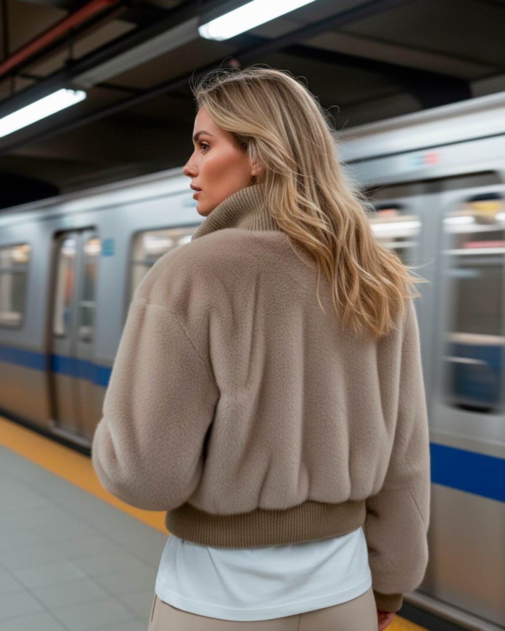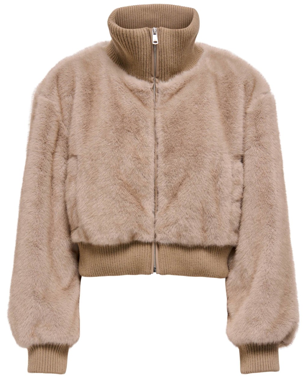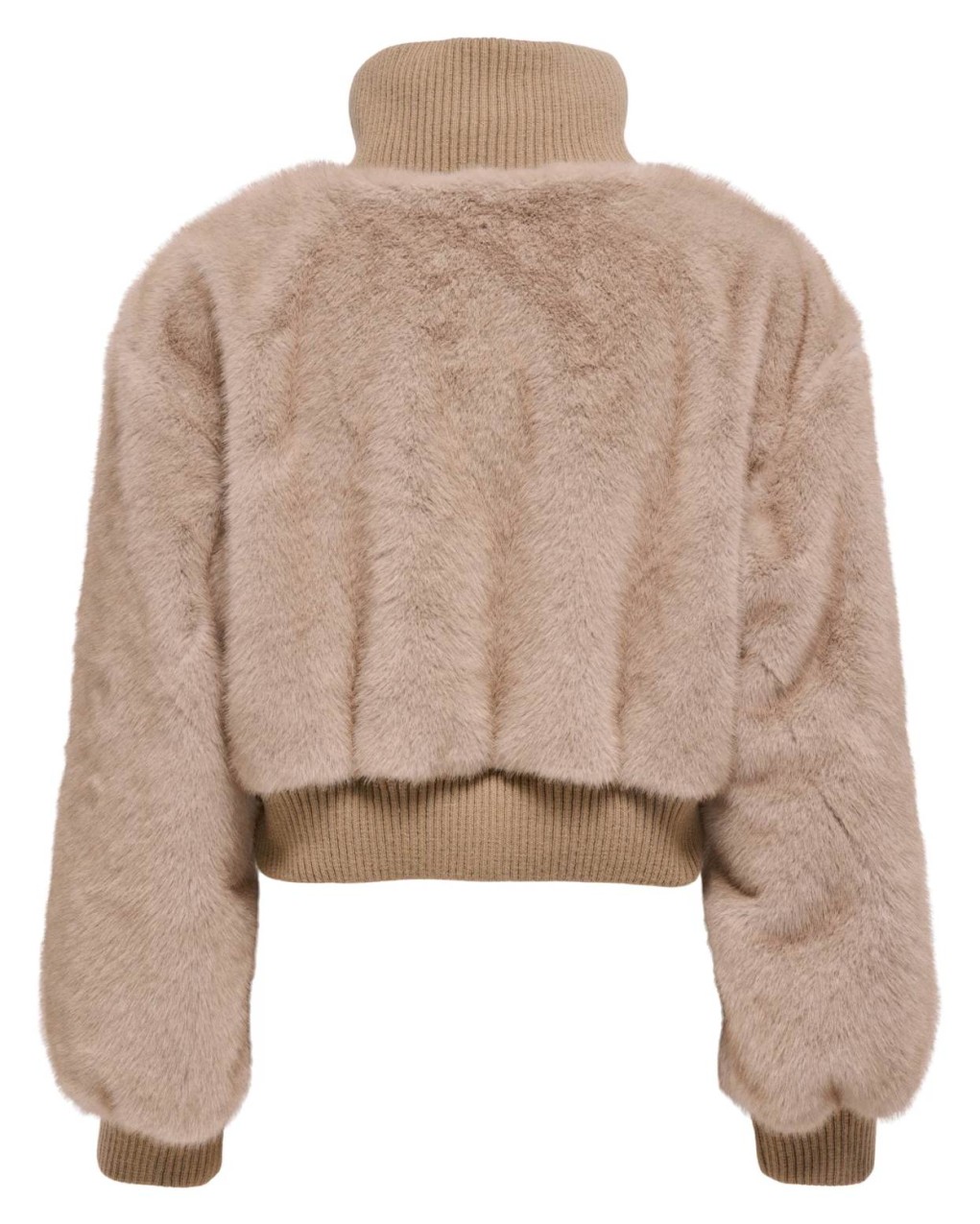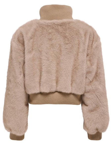 Elegante bomber cropped in morbida pelliccia sintetica con collo alto a costine e chiusura con zip frontale. Il capo presenta polsini e fascia elasticizzati in maglia per una vestibilità confortevole e moderna. La silhouette corta e voluminosa rende questo capo perfetto per outfit casual-chic durante la stagione fredda.