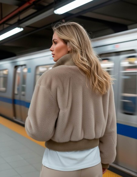 Elegante bomber cropped in morbida pelliccia sintetica con collo alto a costine e chiusura con zip frontale. Il capo presenta polsini e fascia elasticizzati in maglia per una vestibilità confortevole e moderna. La silhouette corta e voluminosa rende questo capo perfetto per outfit casual-chic durante la stagione fredda.