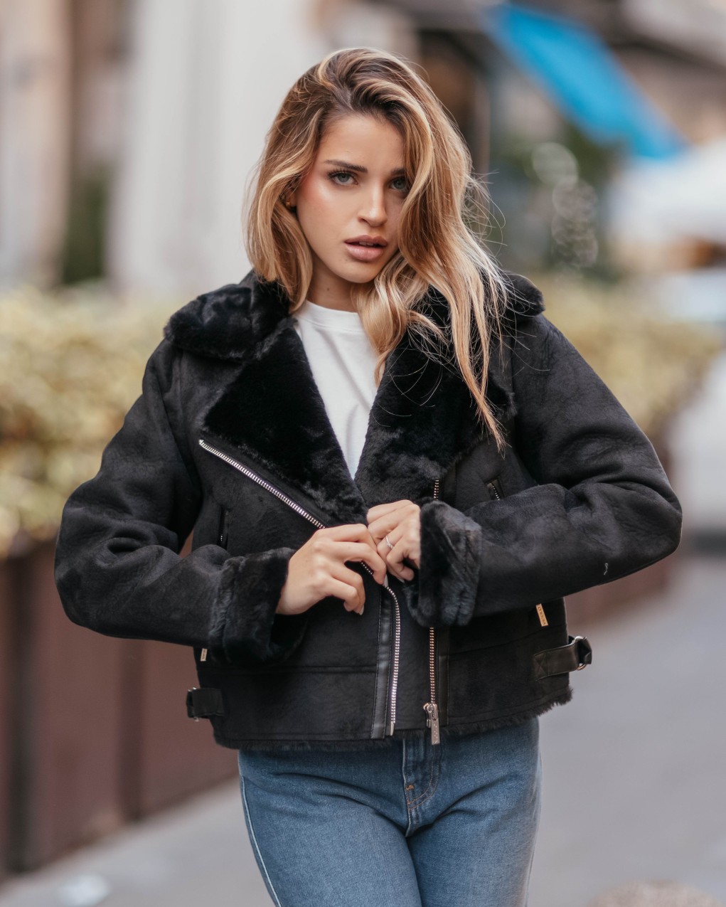 Giacca biker in morbida eco-pelliccia dal design contemporaneo e avvolgente. Dotata di zip metallica asimmetrica e ampio colletto rever, presenta una vestibilità leggermente oversize perfetta per il layering invernale. La texture premium della fodera in faux fur garantisce massimo comfort e calore, mentre i dettagli in similpelle aggiungono un tocco di eleganza urbana.
