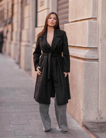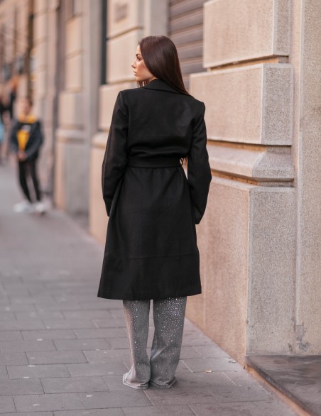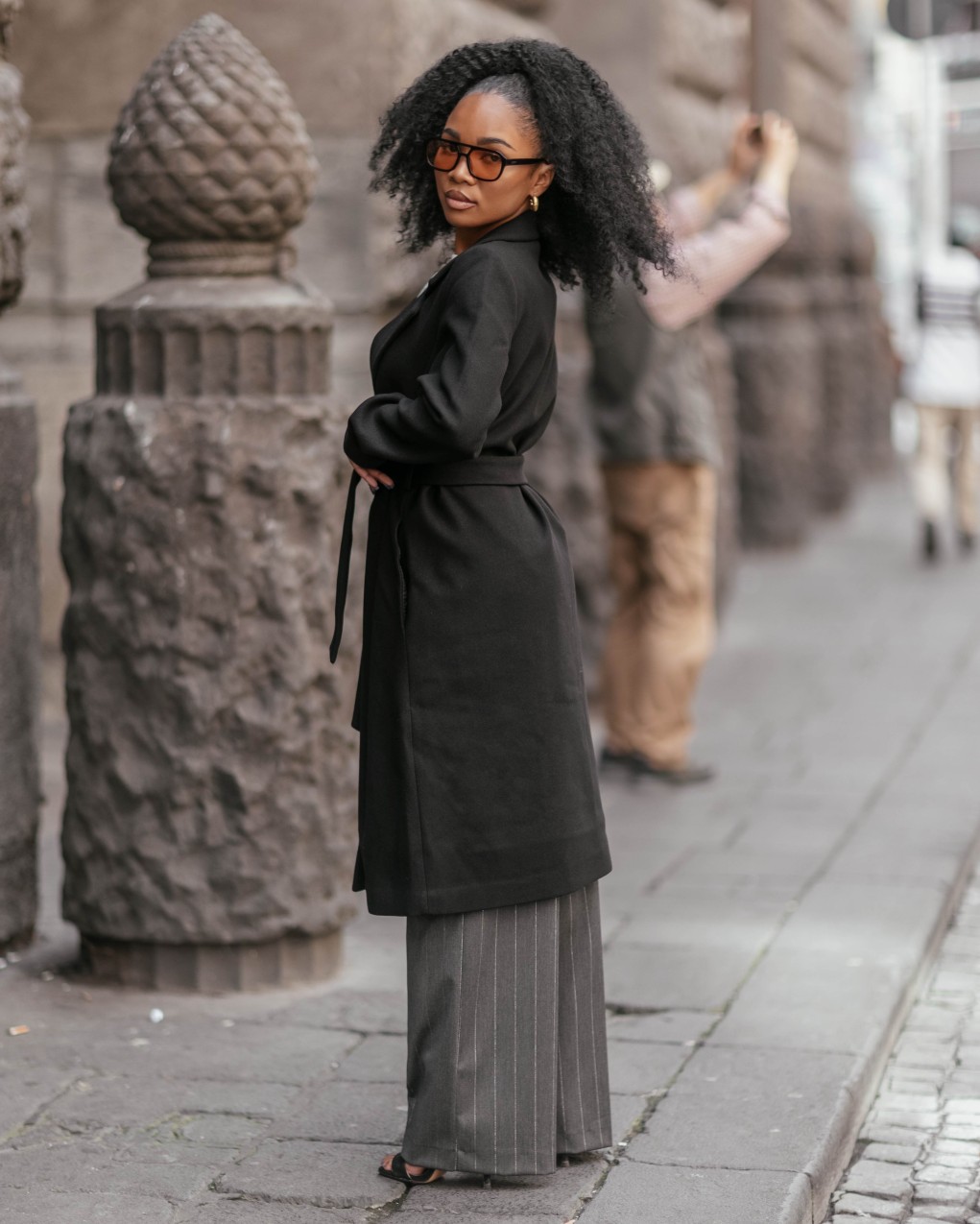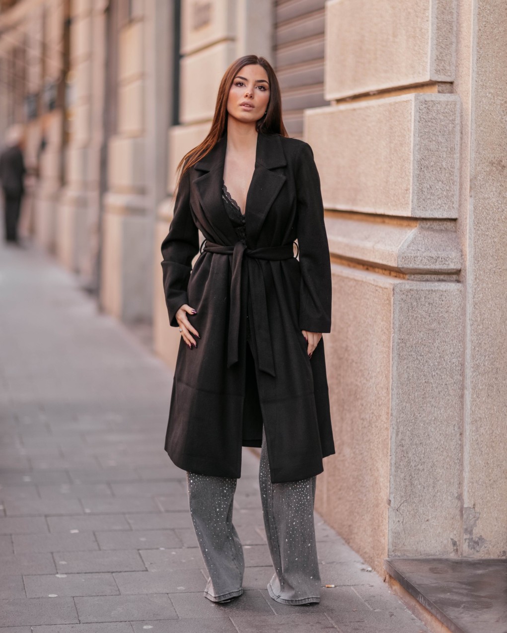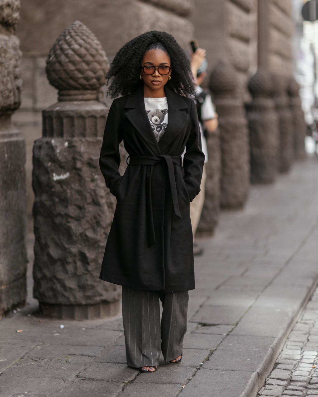 Il cappotto ha una vestibilità oversize e si distingue per il suo tessuto strutturato, perfetto per le giornate fredde